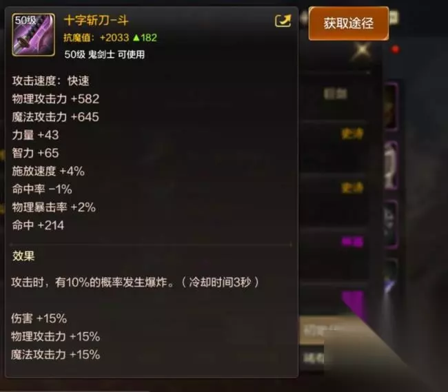 3、十字斩刀-斗 十字斩刀-斗的特殊效果是攻击时,有10%的概率发生爆炸。以及伤害+15%、物理攻击力+15%、魔法攻击力+15%。可以通过制作、委托、深渊、道具中的祥瑞之匣获取该武器。