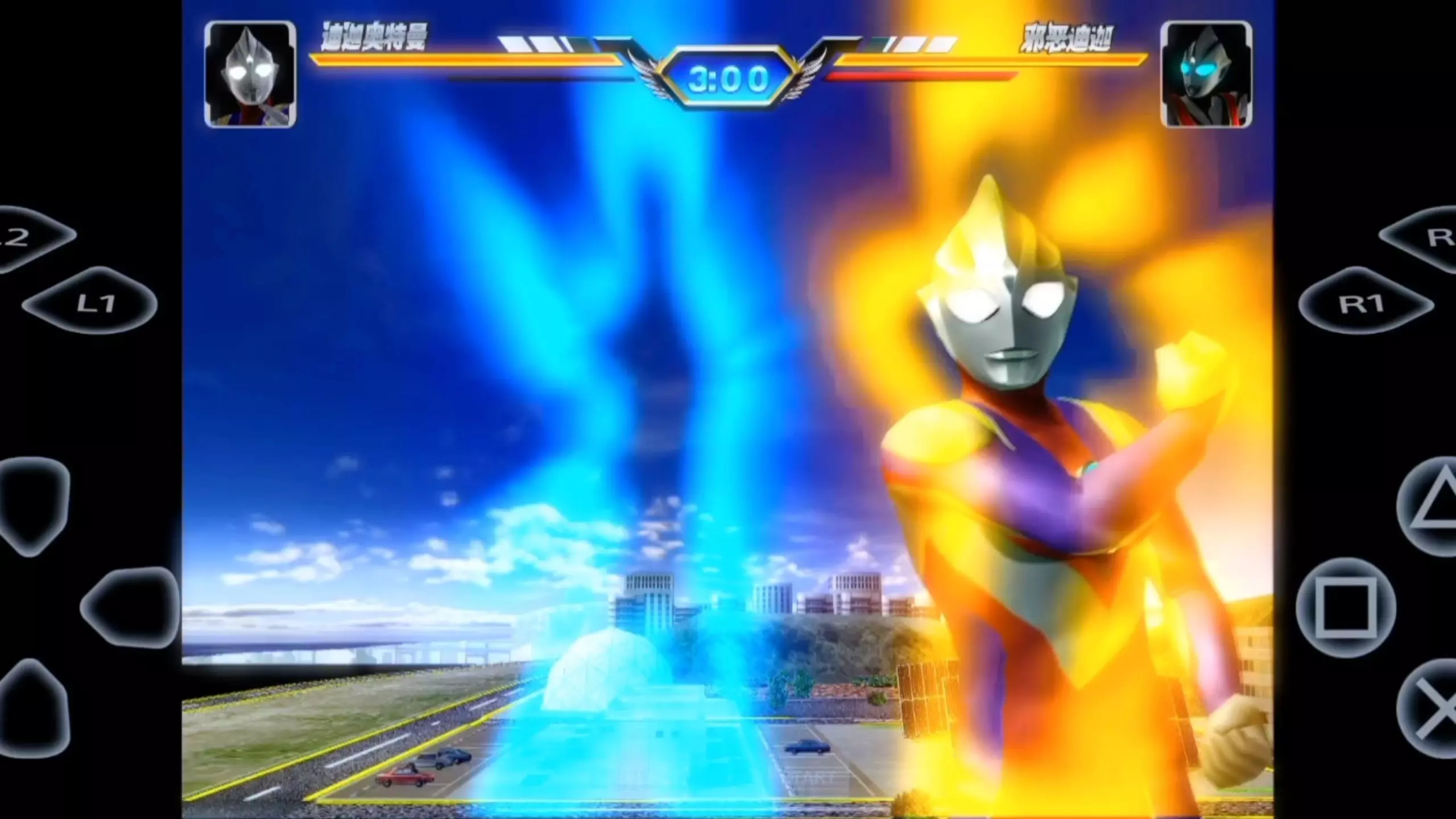 本文展示了奥特曼格斗进化3高清汉化贴图版中,“黑暗的支配者”关卡里迪迦奥特曼与邪恶迪迦一同对战BOSS加坦杰厄的对战场景,呈现了这场S级挑战的对战画面。