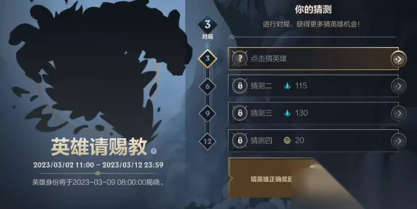 猜测二:机器人 不得不说机器人的原图海报和活动中的影子动作几乎一模一样,但是根据以往活动的惯例,直接一眼可以看出来的应该不太可能,所以可能性为60%。 猜测三:酒桶 玩家之所以会猜测是酒桶不仅仅因为从影子的轮廓看出英雄体型比较大,且可能是个光头,因此排除下来酒桶的可能性就上升了。 猜测四:泰坦 这个英雄的可能性相比于上面三个要小的很多,不过从也是从轮廓大,光头等核心条件中筛选出来的,可以作为预测的第四个选项。 活动规则 1.根据左侧的英雄剪影,猜猜这是哪位英雄吧! ⒉.活动分为猜测阶段与公布答案阶段。猜测阶段为2023-03-02 11:00:00至2023-03-0908:00:00,公布答案阶段为2023-03-09 08:00:00至2023-03-1223:59:59。 3.猜测阶段,每累计进行3、6、9、12场对局(包括但不限于人机、匹配、排位、大乱斗),可领取任务奖励并解锁1次猜测机会,共4个机会。 4.解锁猜测机会后,玩家可根据左侧英雄剪影猜测是哪位英雄,点击已解锁的横条可在指定英雄列表中选择英雄。 5.每位玩家最多可猜测4个答案,猜测阶段答案可反复修改。 6.公布答案后,若玩家的4个答案中含有正确答案,即可领取猜测正确奖励;若玩家进行了猜测但并未猜对,将领取猜测错误奖励;若玩家未进行猜测,将无法领取猜测奖励。 通过233乐园小编整理的英雄联盟手游猜英雄活动怎么玩内容,相信大家更加了解这款游戏了,如果对各位玩家有所帮助的话,大家可以继续关注本站后续更新哦~233乐园小编会继续努力带来更多优质内容。 声明:233乐园登载此文出于传递信息之目的,不代表233乐园赞同其观点或证实其描述,若侵权请来信告知,我们将及时处理。
