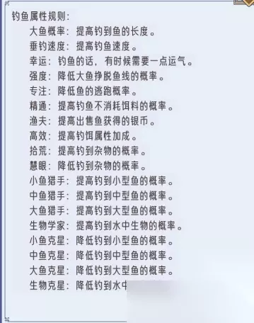 逍遥九重天钓鱼攻略规则 钓鱼过程繁冗,温馨提示,v10可以自动钓鱼哦! 钓鱼属性规则: 大鱼概率:提高钓到鱼的长度。 垂钓速度:提高钓鱼速度。 幸运:钓鱼的话,有时候需要一点运气。 强度:降低大鱼挣脱鱼线的概率。 专注:降低鱼的逃跑概率。 精通:提高钓鱼不消耗饵料的概率。 渔夫:提高出售鱼获得的银币。 高效:提高钓饵属性加成。 拾荒:提高钓到杂物的概率。 慧眼:降低钓到杂物的概率。 小鱼猎手:提高钓到小型鱼的概率。 中鱼猎手:提高钓到中型鱼的概率。 大鱼猎手:提高钓到大型鱼的概率。 生物学家:提高钓到水中生物的概率。 小鱼克星:降低钓到小型鱼的概率。 中鱼克星:降低钓到中型鱼的概率。 大鱼克星:降低钓到大型鱼的概率。 生物克星:降低钓到水中生物的概率。