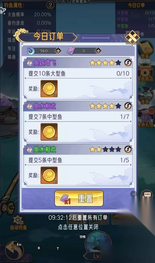 还有就是在鱼塘中有一些道具是可以升级的,小貔貅建议大家完成每日订单后,按照这个顺序进行升级;首先升级鱼竿线,其次升级浮漂,最后升级鱼钩,在这期间要是钓到的鱼不够放了,优先放置稀有的鱼类,尽快升级鱼箱,放置更多鱼类。
