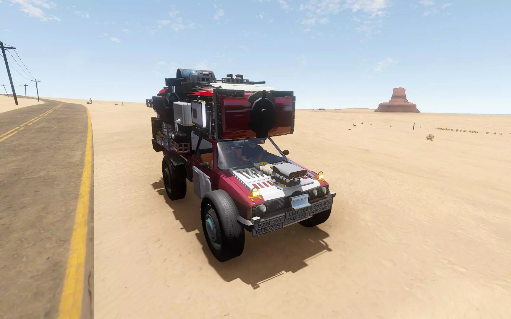 这是一则单机游戏的趣味玩法分享,玩家在游戏里觉得车辆速度太慢,给车辆加装双发动机,还展示了驾驶改装后车辆在沙漠道路行驶、和其他车辆互动的过程,呈现了改装车辆的独特玩法。