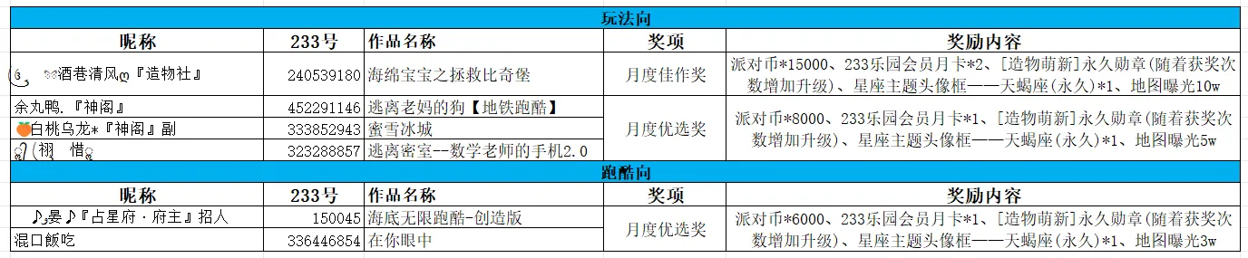 🌟月度优选奖(3-5名):派对币*8000、233乐园会员月卡*1、[造物萌新]永久勋章(随着获奖次数增加升级)、星座主题头像框——天蝎座(永久)*1、地图曝光5w