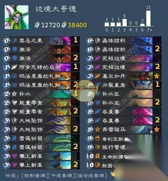 边境大哥德卡组 职业:德鲁伊模式:标准模式天马年 卡组构筑挺有意思,核心牌不少。2x(0)的激活和1x(0)的禁忌之果是启动关键,2x(1)的玛法里奥的礼物和1x(1)的阿肯尼特的启示能快速铺场。2x(2)的能量零食和1x(2)的补水能保证续航。重点是2x(3)的坠饰、2x(3)的攀上新高和2x(3)的雪莲幼苗,这三张牌配合起来效果很好。2x(6)的晶体结积能解场,1x(7)的基尔加丹和2x(7)的究极边境是后期翻盘关键。2x(8)的吞星兽和1x(8)的奔雷骏马能打脸,2x(8)的补水区能控场。1x(0)的奇利亚斯豪华版3000型、1x(0)的奇利亚斯豪华版3000型和1x(4)的病毒模块也很重要。1x(5)的完美模块、1x(9)的旅行管理员杜加尔和1x(10)的生命缚誓者艾欧娜尔能提供额外效果。最后1x(10)的脱困古神尤格-萨隆是终结技。