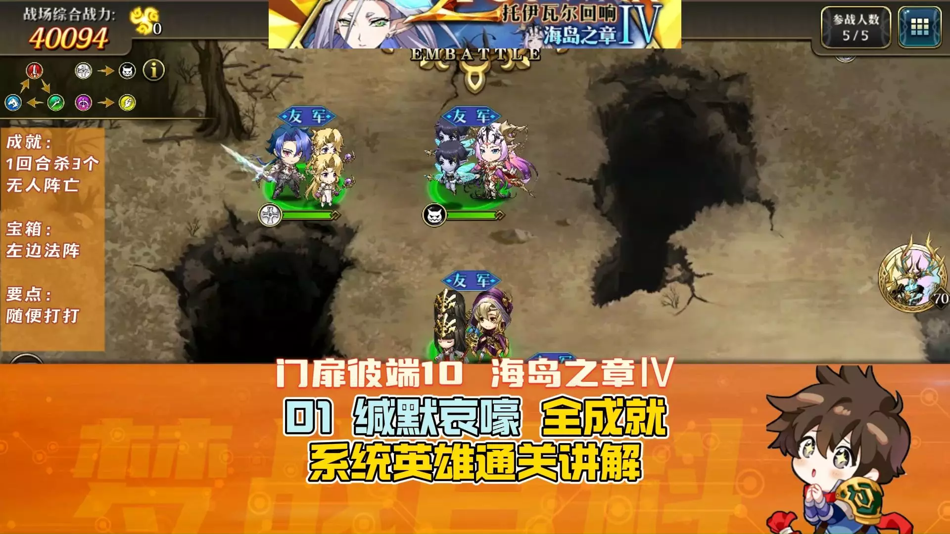 这是《梦幻模拟战》海岛之章Ⅳ门扉彼端10-03关卡的全成就讲解,讲解了该关卡“NPC不死、我方血量过半”的成就达成要点,还有宝箱位置,指导玩家用系统英雄通关,要注意保护NPC、把控血量等。