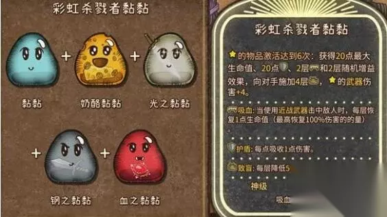 2、彩虹杀戮者黏黏(神级,吸血,神圣,自然,宠物):黏黏+奶酪黏黏+钢之黏黏+光之黏黏+血之黏黏 狂战士职业的专属黏黏