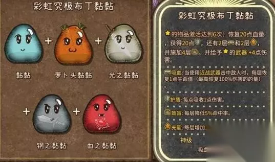 2、彩虹究极布丁黏黏(神级,吸血,神圣,自然,宠物):黏黏+萝卜头黏黏+光之黏黏+钢之黏黏+血之黏黏 游侠职业的专属黏黏,建议搭配兽王子职业进行游玩。