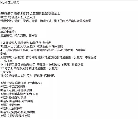 升级顺序:1地狱骑士扈从1原怒者1传统武僧1原怒者9地狱骑士1地狱骑士扈从 【注:这里雷吉尔自带5地狱骑士扈从1地狱骑士的职业等级】 . 属性加点:升级全加敏捷 . 技能加点:这个随意,主加沟通就行 . 思路:利用高尚裁决的附伤BUG(类似拥王者里的奥法裁决者)来实现雷吉尔既强力又RP的加点。这个加点的雷吉尔非常厉害,可以说又肉又有超高输出,可以说打起来满屏幕都是伤害特效。兼职传统武僧只是为了穿武僧袍、加2点全豁免和拿专长,后期还是穿秘银全身甲/秘银中甲(根据最大敏调看哪个AC高、特效好)。兼职原怒者(兼血怒者也行)就是为了拿天界血脉的一级附伤和直觉闪避。大后期喜欢转无甲的,可以把传统武僧换成鳞甲之拳,然后点出大法师护甲。 有高尚裁决的附伤和天界血附伤,搭配圣战之刃,前期主手附伤:4d6+(1d6+4d6)+(1d6+4d6) = 14d6神力伤害,副手附伤:2d6+(1d6+2d6)+(1d6+2d6) = 8d6神力伤害。 地狱骑士10级后,主手公正破敌(圣战之刃给主手武器邪恶异界生物破敌附魔),副手神圣公正(地狱骑士大招给武器加公正附魔),主手和副手的附伤都是:4d6+(1d6+4d6)+(1d6+4d6) = 14d6神力伤害。搭配辟乱斩(10级地狱骑士)、正义烙印(15级圣武士)和引领打击,总附伤为:4d6+25+(1d6+4d6+25)+(1d6+4d6+25)+Xd6+25 = 14d6+Xd6+100,X为神话阶层。伤害极其爆表,如果再搭配天使道途的天堂宝剑和光之墙,这伤害简直太美。 不用担心bug被修复,因为我怀疑毛子根本不会修复这个bug,这个BUG从拥王者一路流传下来。拥王者附伤流比较有名的就是核弹剑仙,还有圣武士。 . 定位:有一定防御能力的重甲敏捷双持输出,虽然是敏系有直闪,但是难度高了还是不能第一个接敌。前期攻坚能力爆表,后期成长性也不错。后期可以先缩小再伟岸雄姿来增加一些攻击范围,或者诡计大师道途缩小术+微缩雄姿来增加超高敏捷和AB。因为不出食人鱼打击,又有辟乱斩和正义烙印叠加效果,武器训练和决斗手套,天生小体型+缩小术,所以这个BD的AB极高。但是打非混乱的敌人非常无力,可以说是专门用来打恶魔的。 . 专长选择: 1双武器战斗 2【战斗专长】:武器专攻(侏儒勾锤) 3武器娴熟 4【战斗专长】:武器专精(侏儒勾锤) 5进阶武器训练:战士娴熟 7包抄、【战斗专长】:精通双武器战斗 9抓准时机、【武僧奖励专长】:战斗反射 11高等双武器战斗 13炫目武技 15粉碎防御 ---可以提前到13级,把高等双武器战斗放到这里 17自由专长 19自由专长 . 1双武器战斗 2【战斗专长】:武器专攻(侏儒勾锤) 3武器娴熟 4【战斗专长】:武器专精(侏儒勾锤) 5进阶武器训练:战士娴熟 7包抄、【战斗专长】:精通双武器战斗 9抓准时机、【武僧奖励专长】:战斗反射 11高等双武器战斗 13精通重击 15精通精通重击 17精通精通精通重击 19精通精通精通重击精通 . 血怒者血脉:天界 . 神话专长和能力: 神话能力:无限狂暴、引领打击、屹立不倒、常备不怠、无穷辟乱斩 神话专长:武器娴熟(神话)、双武器战斗(神话) 神话专长和能力的点法很多,我这里只提供一种点法:1无限狂暴、2武器娴熟(神话)、3引领打击、4常备不怠、5双武器战斗(神话)、6屹立不倒、7无穷破乱斩 . 关键装备(暂定):高尚裁决(第二章主线会掉落)、决斗手套、次级决斗手套 进入《开拓者:正义之怒》专区 查看更多《开拓者:正义之怒》攻略 恶心 愤怒 感动 路过 无聊 雷囧 顶0踩0 上一篇: 命运2神隐赛季术士预言尾王单人无暇攻略 下一篇: 功夫小子——巨神过85BT任务