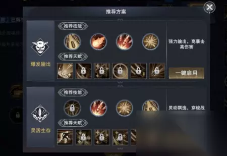 生存向:【身法训练】【风暴气旋】【跃动装填】【气势压制】【爆破手雷】【战术撤退】 推荐理由:这套天赋主攻免伤,【身法训练】主要加强【灵动突袭】的伤害偏斜,【爆破手雷】和【风暴气旋】有着的控制能力,【气势压制】能给敌人附加伤害降低DEBUFF,适合BOSS攻坚,【应急救护】加强回复能力,适合大多数的战斗场景。