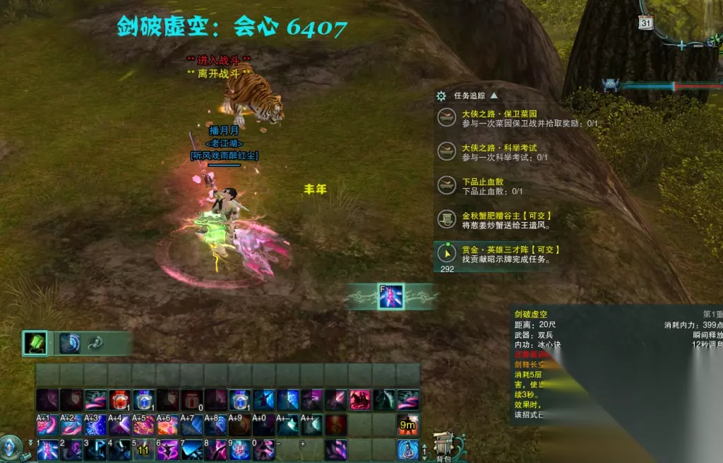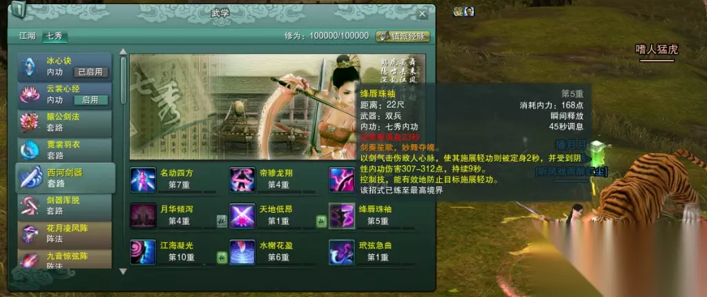 剑破虚空:目前版本七秀最强1~2人输出技能,打boss以及打数量较少的小怪时有着很不错的表现。缺点是需要6层以上剑舞才能施展,同时cd要12秒,在pvp中不好使用。 输出手法:一般顺序是玳弦急曲—剑主天地—剑气长江—剑破虚空,有增强输出的辅助技能的话可以先用。 群体输出