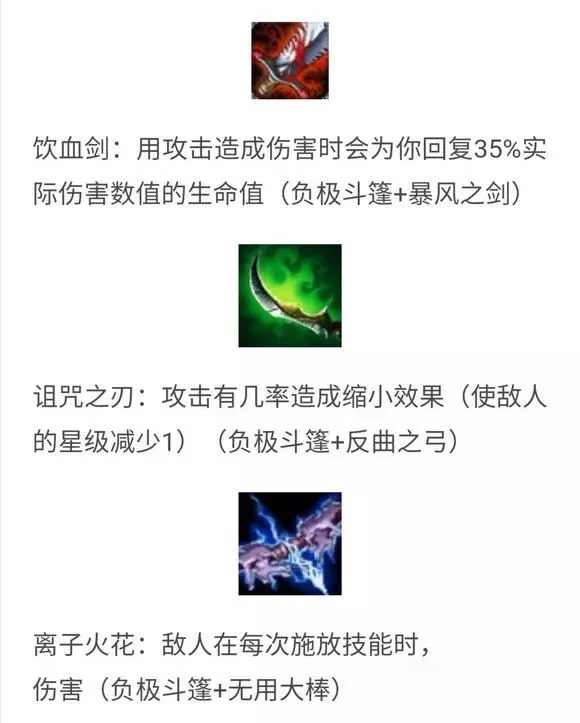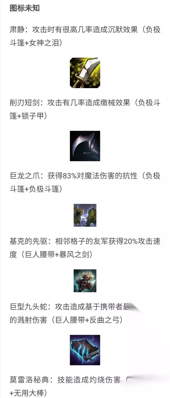 由于现在云顶之弈还在测试阶段,所以有些装备图标可能与正式服之中有些许差异。 暴风大剑系列