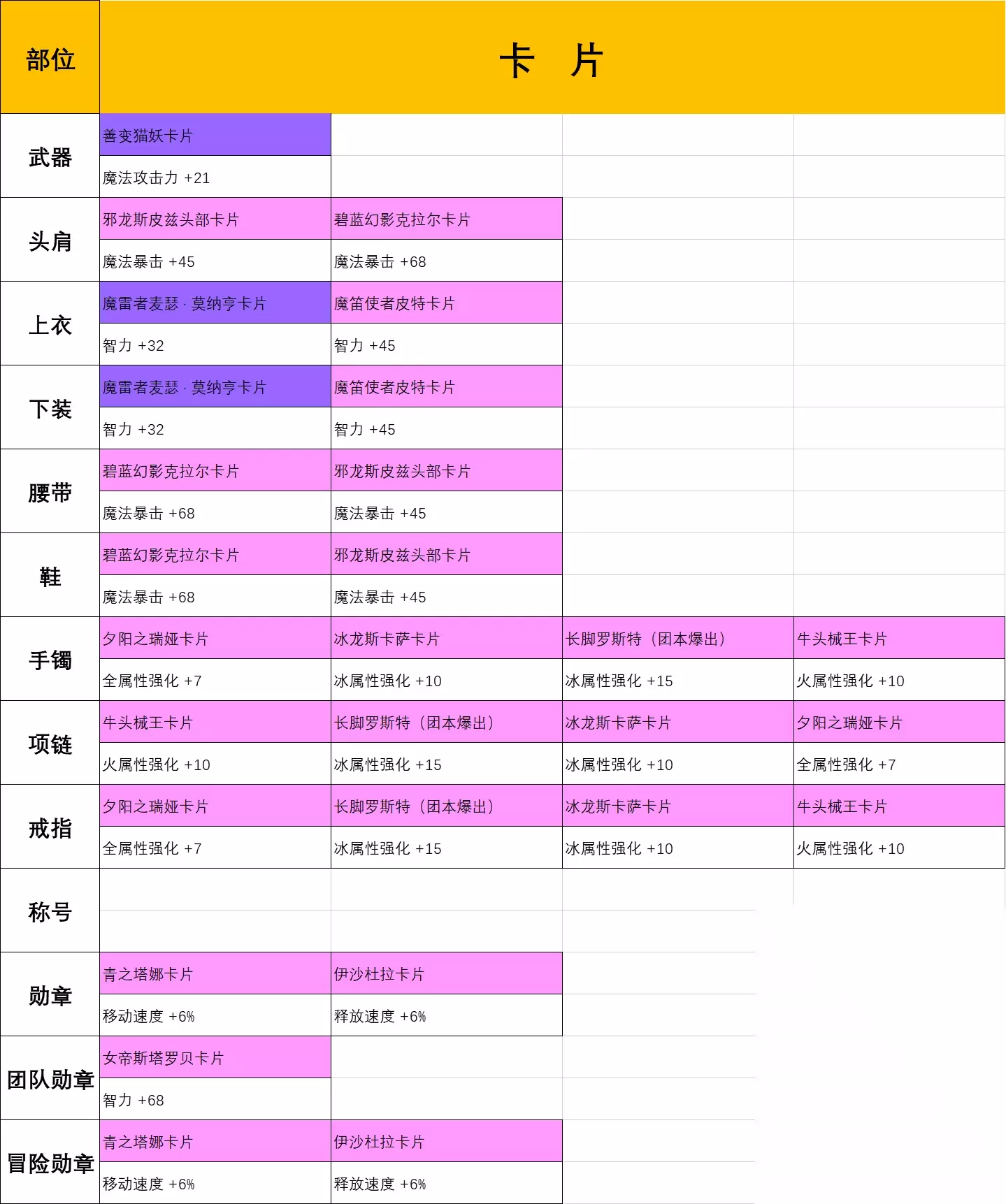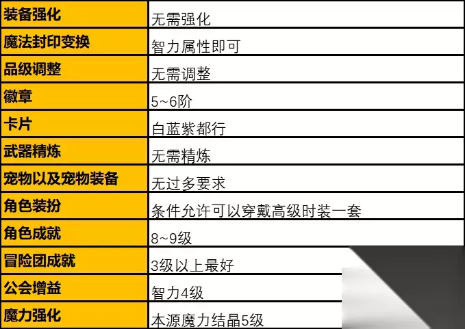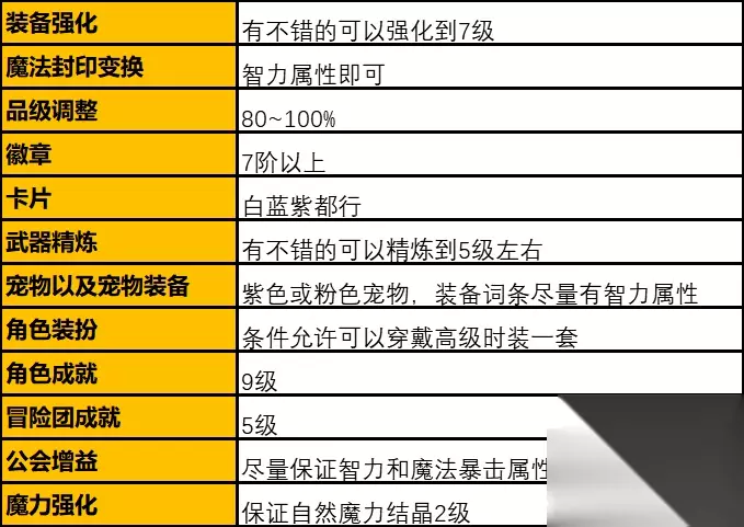 不知不觉我们的装备就毕业了,在毕业阶段对于装备的打造就要讲究细节了,即使是非常细小的提升也是要去打造的。首先防具的强化尽量要有9级或11级,经过本人的测试防具强化在8升至9级和10升至11级提升比较大,因为11级以后的提升比较困难,所以尽量保证自己有9级或11级的防具即可,后续有条件的可以继续往上强化,当然要做好失败的准备。武器和勋章的强化11以上是最佳的,武器能给我们带来巨大的魔法攻击力提升,直接影响我们在副本中的伤害,自然是强化等级越高越好。勋章的强化相比于其他装备消耗的材料和金币比较少,但是也不能使用【幸运符】提升强化几率,这使勋章的强化在11级以后就变的非常的困难,尽量保证自己有11级以上的勋章,勋章给我们带来巨大的四维属性提升,直接影响了面板的属性,优先级可以比防具高一些。大家所有产出的装备尽量保证有魔法封印,因为魔法封印变化带来的属性也是巨大的,词条的选择以命中/智力/属性强化为主,因为现在史诗装备中有一条属性是固有不可变更的,所以我们可能需要大量的时间去刷史诗装备,来赌一下这个完美的固有词条了,这可能需要耗费大量的时间和精力,但是当那条固有出现智力或属性强化甚至是伤害增加的时候,那种刺激的感觉还是很开心的。所有装备的品级尽量都要有90~100%,千万不要小瞧这几点属性的提升,每个装备的几点提升,全身加起来就很可观的,对于毕业装备的打造一定要做到“细”。徽章是我们在初期和中期就开始培养的,我们在最终阶段保证自己的徽章等级有9阶以上,满阶的红色智力徽章可以为我们提升55点属性,全身可以打6个智力徽章,这就是330点智力,这种提升是巨大的,所以我们尽量越早的培养徽章越好,同样的公会徽章和白金徽章也要保证拥有4~6阶。宠物最好是有史诗品级的,宠物装备粉色与史诗都行,主要是装备词条中必须要有智力/魔法攻击力/属性强化的加成。如果你积攒了很多泰拉石,或你是土豪玩家,那么你可以着手于稀有装扮的合成了,多个同部位的时装配合【装扮合成器】有概率合成稀有装扮,稀有装扮的提升虽然不是很大,但是是真的帅,而且你在城镇中跑的也快了,走路带风。公会增益我们一定要保证智力和魔法暴击是满的,直接提升面板属性谁又不爱呢。最后就是魔力强化了,金币充足的情况下一定要把智力和命中点到15级,但10级以后消耗的金币太多,我们也可以点一些其他的属性,最终让自然魔力结晶达到3级,15点全属性强化,它不香么?卡片最终的选择我在下方整理出了表格,可以根据自己的实际情况来选择。卡片这个东西,怎么说呢,有的时候你有钱也买不到,太稀缺了。
