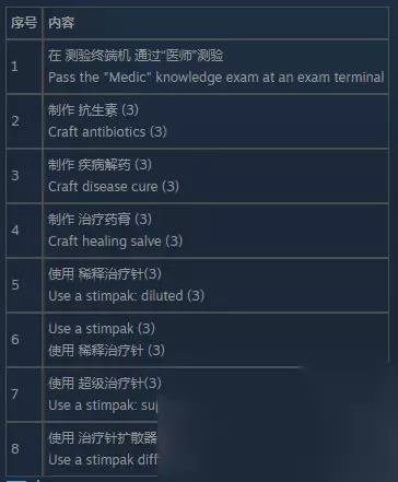 要点: 1.抗生素(Antibiotics)配料为:3x防腐剂(Antiseptic)1x血袋(Blood pack)2x疾病解药(Disease cure)2x纯水(Purified water)1x治疗针(Stimpak)。 血袋(Blood pack)刷新位置: