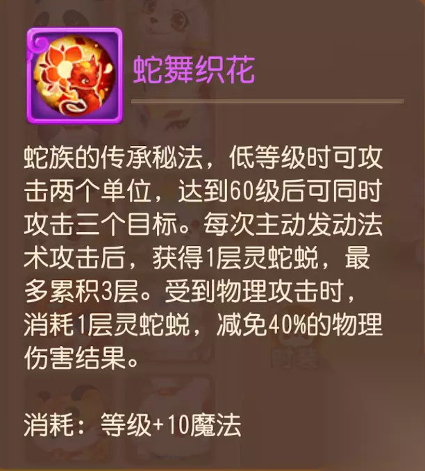 蛇舞织花:蛇族的传承秘法,低等级时可攻击两个单位,达到60级后可同时攻击三个目标。每次主动发动法术攻击后,获得1层灵蛇蜕,最多累积3层。受到物理攻击时,消耗1层灵蛇蜕,减免40%的物理伤害结果。 超级神蛇绑定技能为蛇舞织花、高级法术波动、高级法术连击,受特殊技能影响,超级神蛇更加注重灵蛇蜕的功能性,是一只适用于耐法方向的神兽。 灵蛇蜕最多可累积3层,单回合最多可减免3次40%的物理伤害结果,如果对战召唤灵拥有连击技能,触发连击时会消耗两层灵蛇蜕。 专属内丹