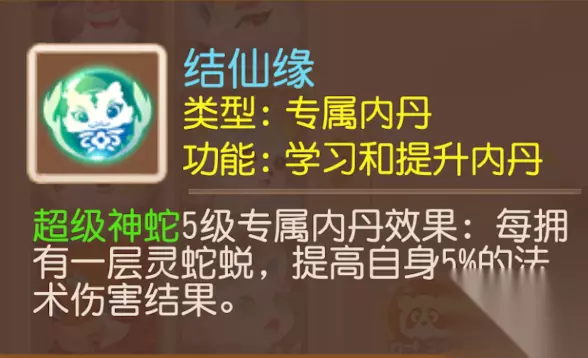 结仙缘(5级效果):每拥有一层灵蛇蜕,提高自身5%的法术伤害结果。 除了能够减免物理伤害结果外,3层的灵蛇蜕还能提高自身最多15%的法术伤害结果,协力法大军又有新的成员加入了~ 专属套装