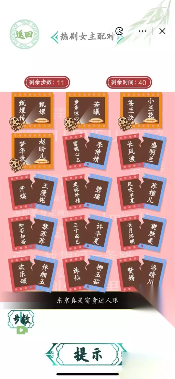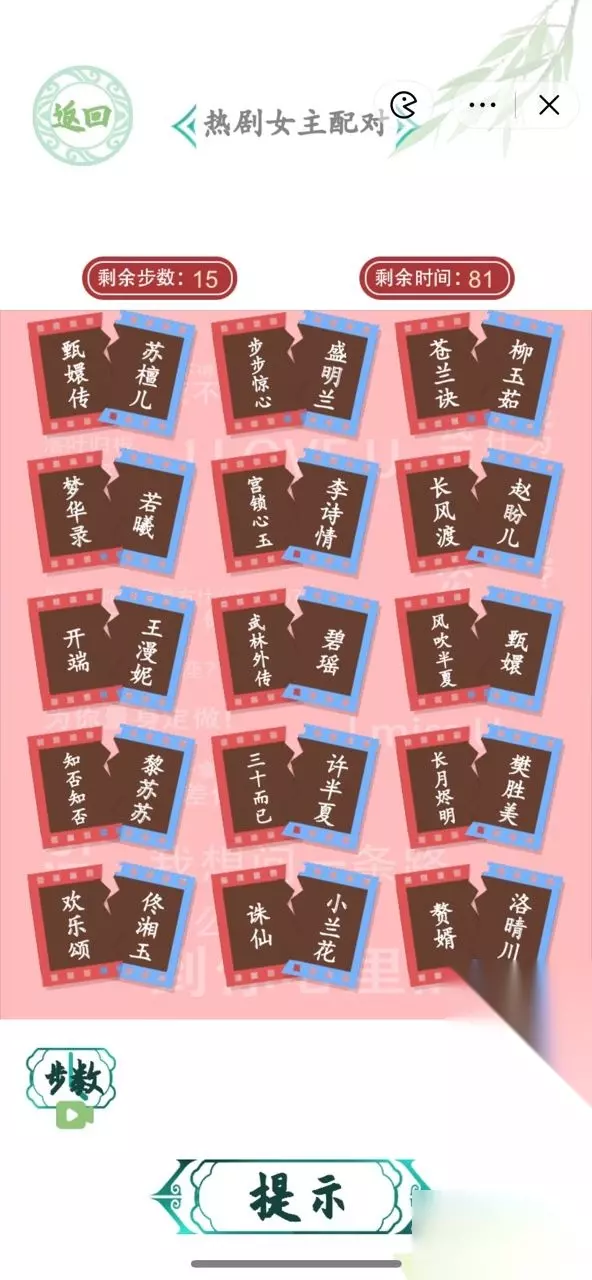 汉字找茬王热剧女主配对答案 甄堰传一甄; 武林外传-佟玉; 三十而已-王漫妮; 长风渡-柳玉茹; 欢乐颂-樊胜美;