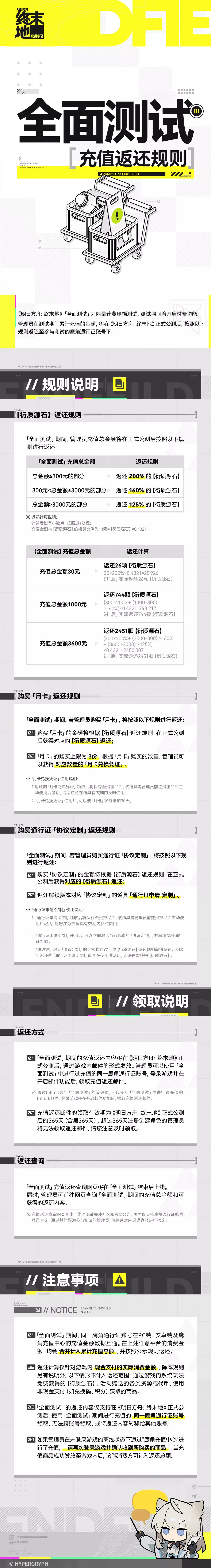 《明日方舟:终末地》「全面测试」为限量计费删档测试,测试期间将开启付费功能。管理员在测试期间累计充值的金额,将在《明日方舟:终末地》正式公测后,按照以下规则返还。