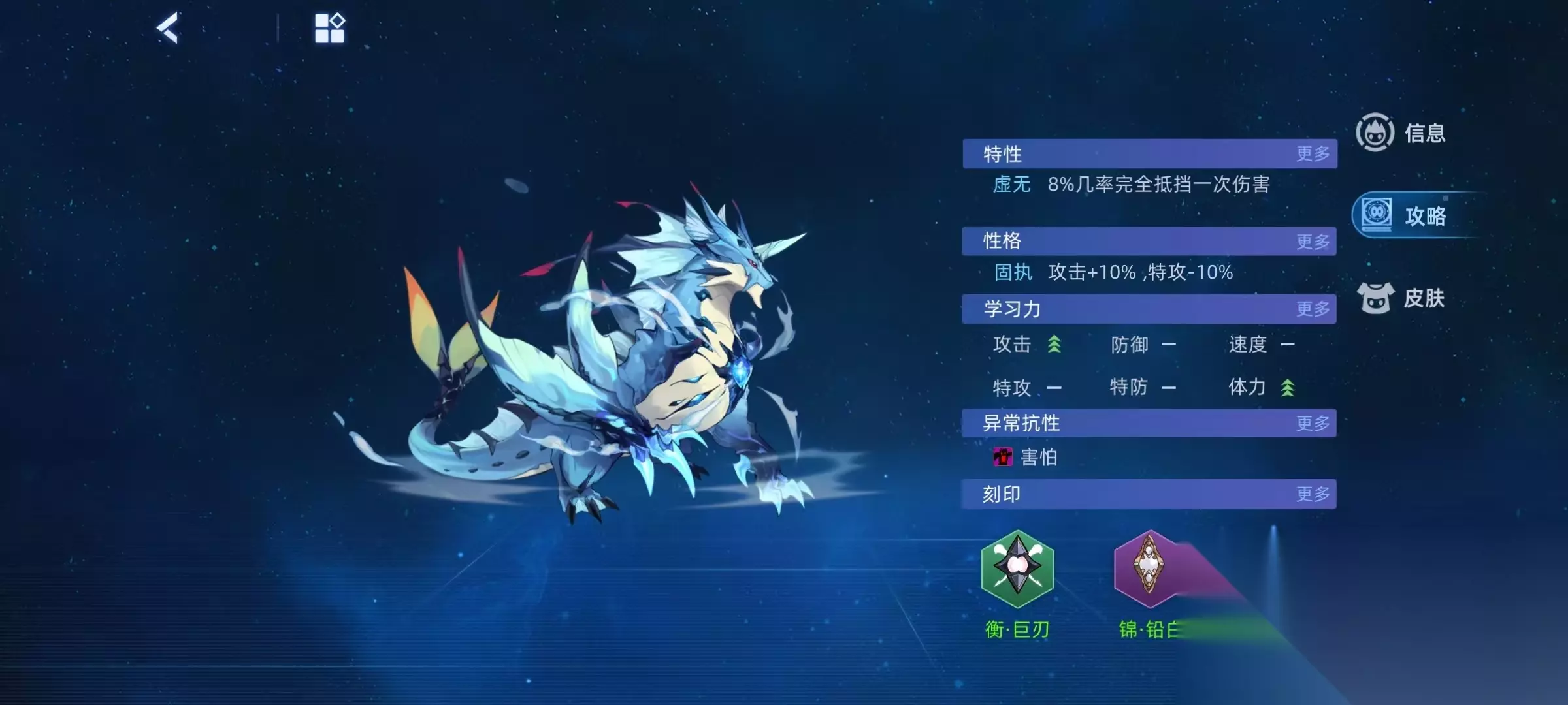星光随风逐浪,自身属性加1,当前体力高于最大体力的1/2时,强化效果翻倍,下两回合自身造成的攻击伤害翻倍,攻击忽略对手25%双防值。若自身选择使用技能,则无视对手能力提升状态。星光排山倒海,可无视攻击免疫效果,无视对手护盾效果,命中后50%使对手冰封,给对手造成伤害时,按照伤害数值的50%来恢复自身体力。星光浪打千击,一回合打出5~10次攻击,每次攻击都有几率提高自身攻击、速度和命中加1,消除对手回合类效果。为了强化优势,培养的时候选择虚无特性,有几率抵挡伤害。性格推荐固执或者是调皮,孤独也可以。学习力选择提升攻击和体力,异常抗性选择免疫害怕或者是免疫麻痹。