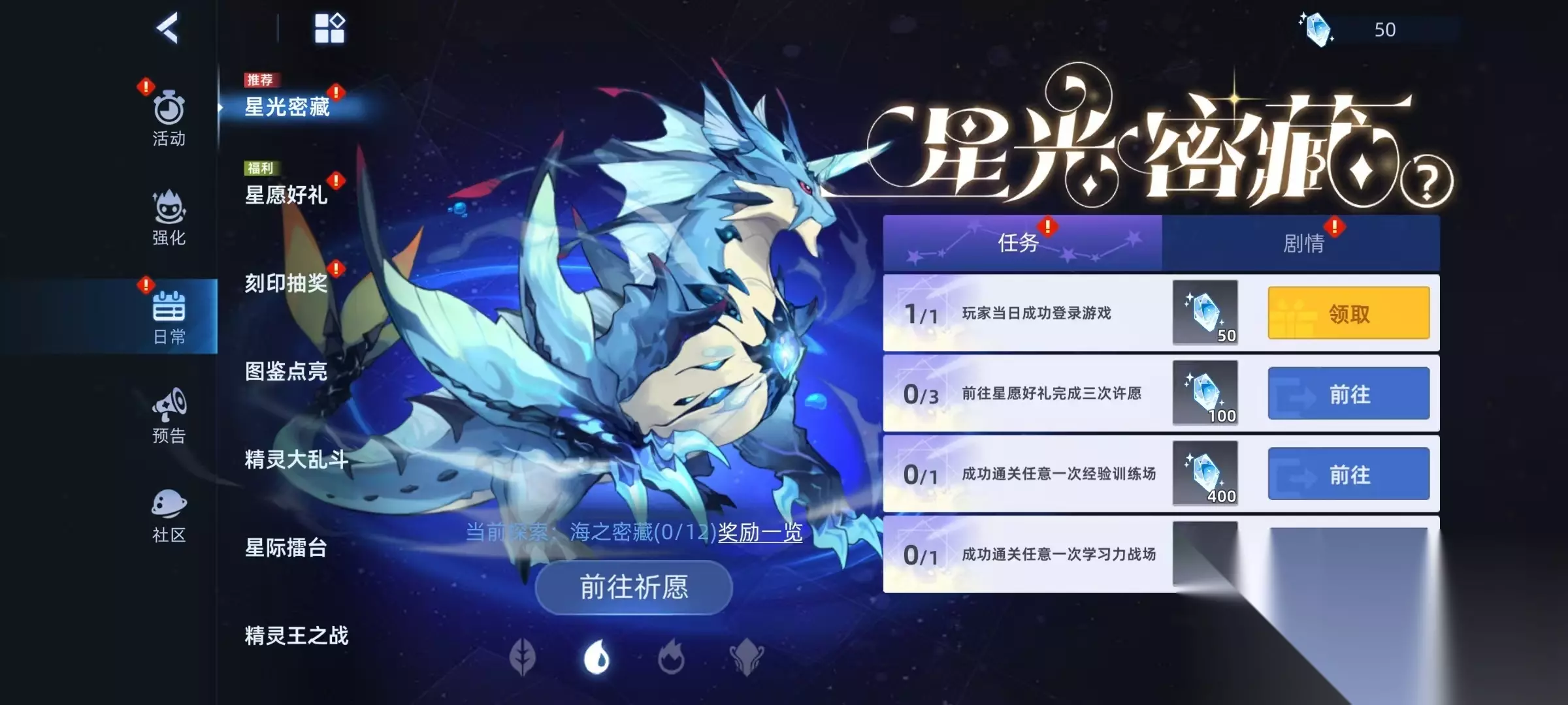 玩家在手游中只需要参加星光密藏活动,在探索海之密藏的页面中完成任务,就可以领取到这个精灵。星光鲁斯王的专属特性有强攻、封属、辅助等,而且这些特性对boss也是有效的,这些特性使得自身还有额外效果,例如每次使用攻击后,会附加三回合的星海之浸,自身所有技能必定打出致命一击等。所具有的强力技能包括星光闪击,星光水天一色,星光随风逐浪,星光排山倒海和星光浪打千击。