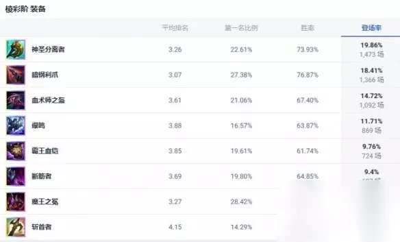 2、棱彩装备推荐 神圣分离者、暗钢利爪、血术师之盔、爆鸣、霸王血铠、断筋者、魔王之冕、斩首者
