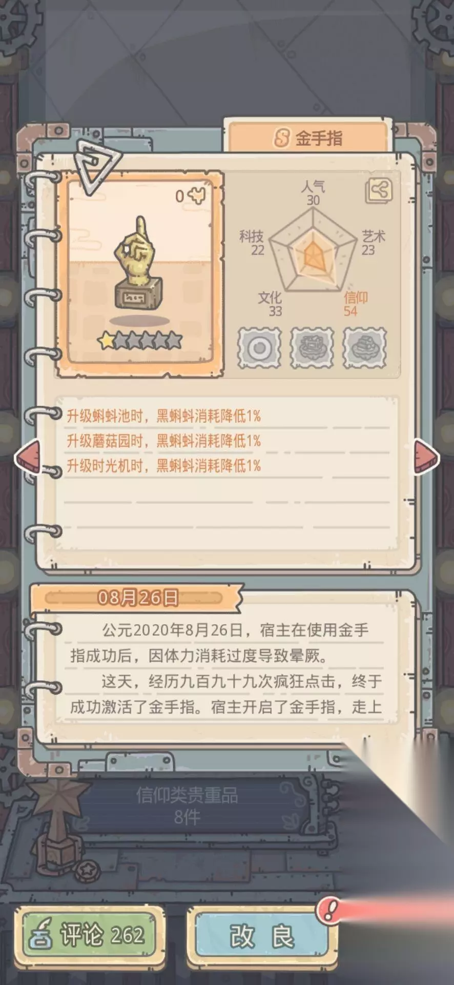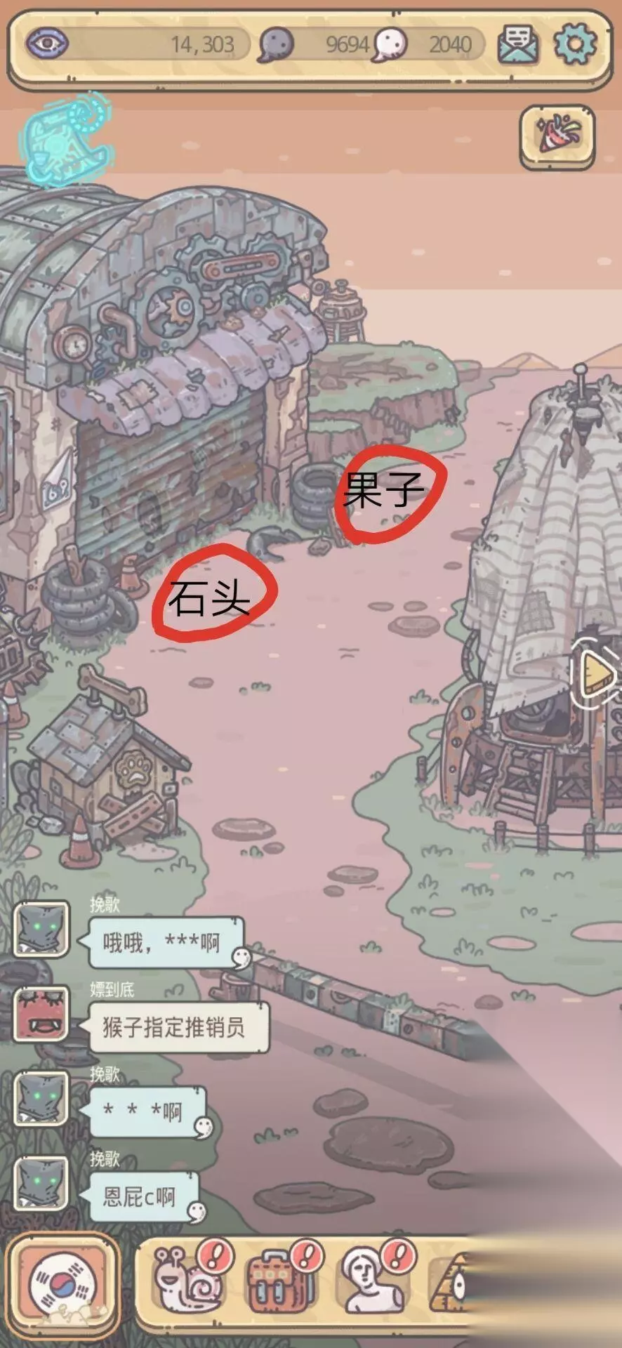 最强蜗牛金手指怎么获得?这是游戏里的一个彩蛋物品,想要拿到它还是得下一番功夫的,看完小编给大家带来的这篇最强蜗牛金手指获取攻略,希望各位看完都能得到帮助。 最强蜗牛金手指怎么获得 首先在最左边大铁门的前面会有一个石头,玩家需要将这个石头手动点击1000次,即可获得一个橙色贵重品-《金手指》(1000次没有连点器的我差点把手指嗯抽筋了)并且在地图上方地上经常会有一个果子,点击后就会获得食物,食物可用于探索补给
