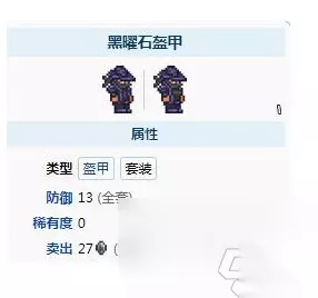 注:升级到1.4.1版本后,黑曜石套装效果将自动激活。黑曜石套装的效果是泰拉瑞亚1.4。只有1 个版本。如果低于这个版本,则没有设置效果。套装效果:总共13点防御值,但没有套装加成。在不考虑套装奖励的情况下,黑曜石盔甲的防御值与金盔甲相同。 1.设置效果: 1. 总共获得13点防御值,但没有套装奖励。制作全套需要60 块黑曜石和30 块丝绸。 2.在不考虑套装加成的情况下,黑曜石铠甲的防御值与金铠相同。 2.具体属性: 1. 号码:3266/3267/3268 2. 品质:白色 3.总防御:13 4.价格:27银 5.组成:由黑曜石逃亡帽、黑曜石风衣、黑曜石裤等一系列套装组成。