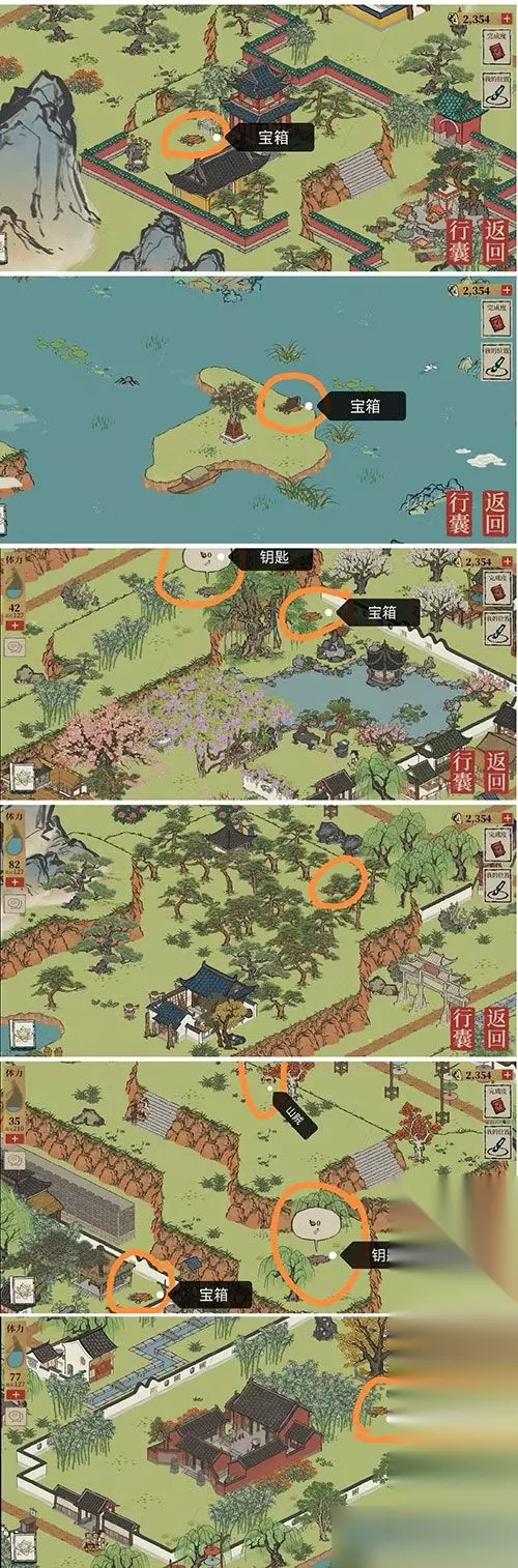 江南百景图长恨歌宝箱怎么找?这个游戏里头的长恨歌宝箱确实是个头疼事儿,一共有6个,位置都挺隐蔽的。我们得花点心思才能找到它们,钥匙也是6把,同样不容易搞到手。游戏鸟小编倒是把所有宝箱位置都汇总了,有需要的可以看看下面这份攻略。 长恨歌宝箱位置揭秘 这些宝箱藏得挺深,大部分都在迷雾里头,所以得先想办法把迷雾散开才行。 很多迷雾得靠点花灯来散,但不是直接点对面的那个,得找找感觉。 有些材料得去南北行兑换,有三个地方,挺容易找到的。 长恨歌强盗藏身之处 这个强盗也挺难找,就在两棵树中间,颜色和树差不多,叶子还挡了一半,所以很多玩家都错过了。 图上这个位置就是强盗藏身地,在伞旁边的小山坡上,靠近了就能发现。 宝箱钥匙获取 钥匙位置和宝箱一样,都是6个,得一个一个找。 有些钥匙需要完成特定任务才能获得,所以得多做做游戏里的活儿。 图片展示