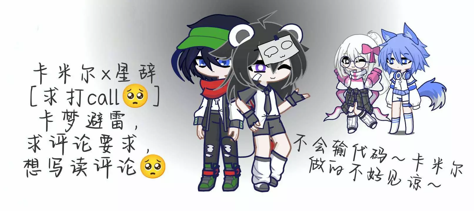 这个卡卡是找代码的,感谢一下“不要打错蜇字了”老师☺️也算艾特了,从第1张的小矮子成了高矮子,我的比例是按照卡卡来调的,不算半改🌚第3张故事情节未完待续,第4章乱做的🌚
