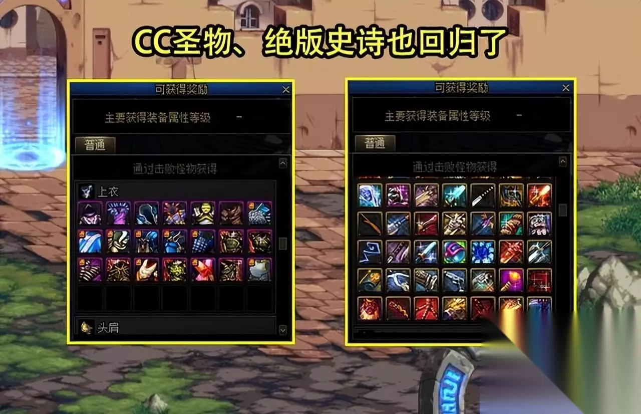 但事实上,不仅领主粉丝回来了,CC遗物套装,甚至绝版史诗也回来了,CC圣物套也是早期版本的产物,让玩家印象深刻的有控魂套、荣耀套。绝版史诗方面,无影剑、征服者之翼,月之光芒这些经典装备都在其中。 所有人都可以携带光炎剑