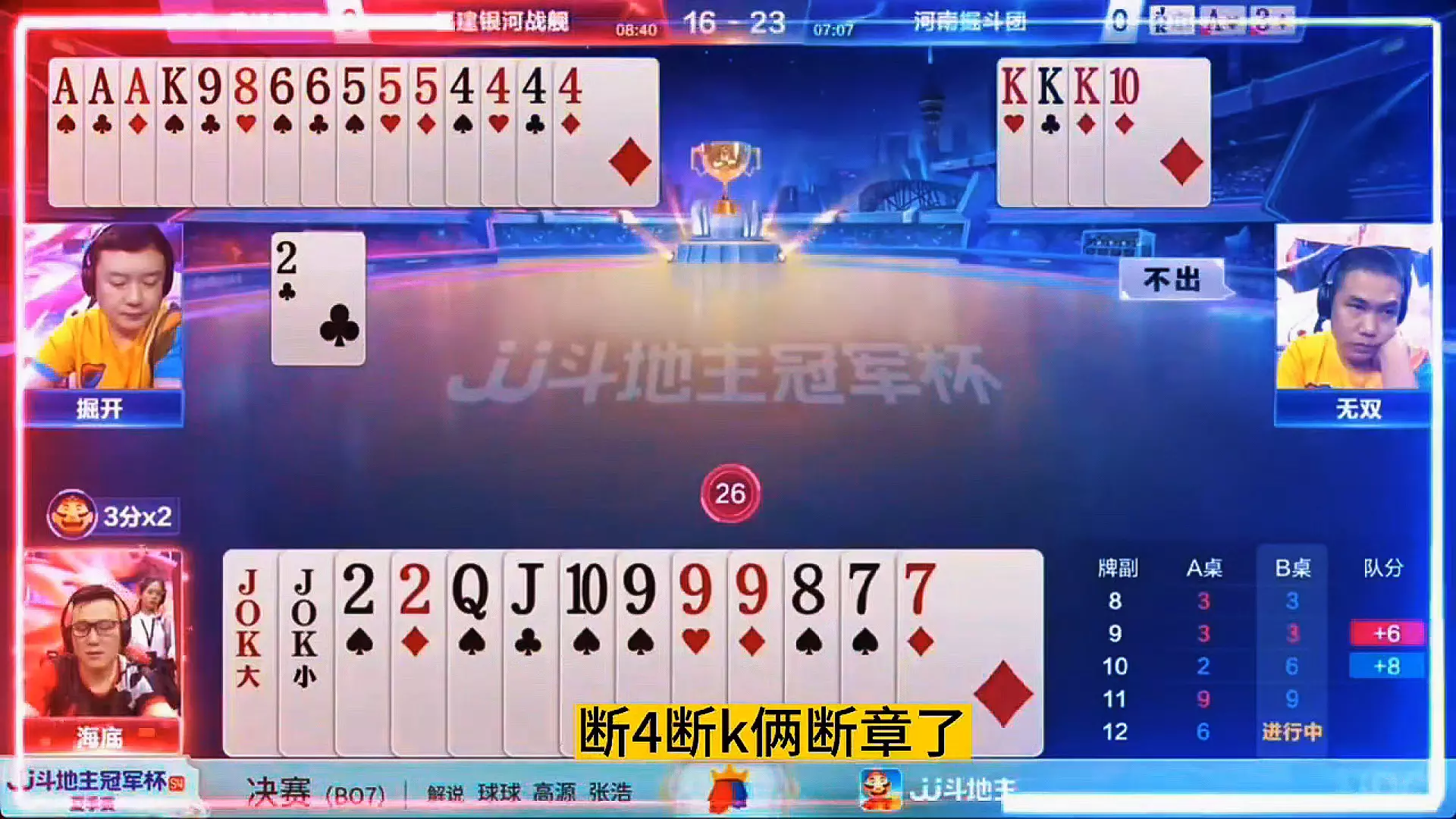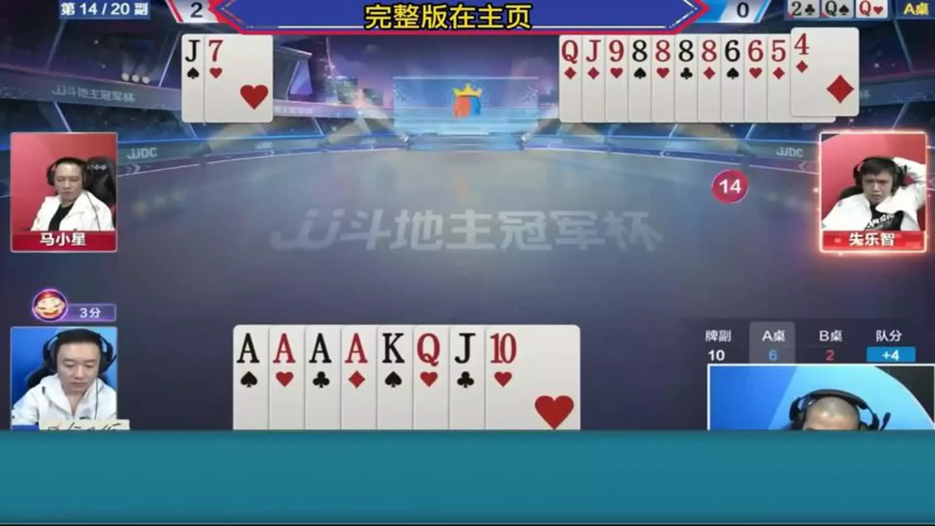 新人速度一手开天眼行牌的四带两对打出了唯一获胜的方式!