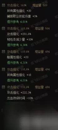 首饰部位手镯都是更强力的词条不会用上面这些词条,主要是项链、戒指。 项链和戒指的自定义词条一般除专属的2个词条后都要用公用词条,上图是魔女戒指的词条。有一个攻击强化和韧性条减少量+10%的词条,该词条一部分的情况下比20单属强强,一部分情况比20单属强强。但是强的很有限,基本可以当作同强度对待。 项链戒指的20全属强基本都是毕业词条,剩下一个词条在20单属强,18全属强,异常状态持续时间(包括中毒出血灼烧感电以及冰冻眩晕混乱石化等这一系列的词条都是同强度)在这里面有一个即可。基本上都是3.8以上的词条。 如果两条中没有20全属强的词条,而有两个截图中的同类词条也可作为3.5词条的自定义使用。 【特殊装备部位】