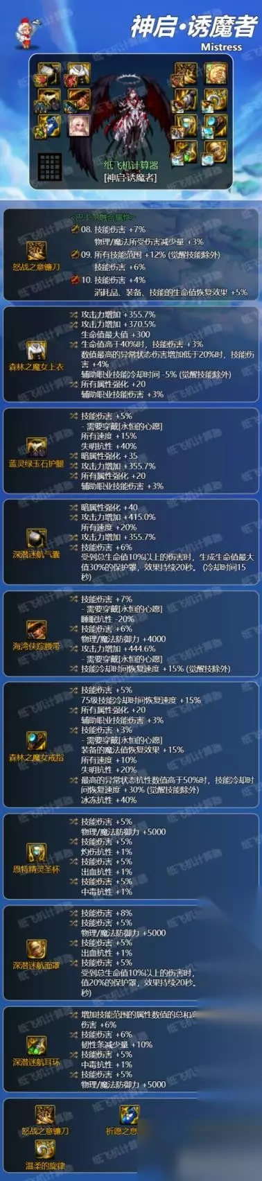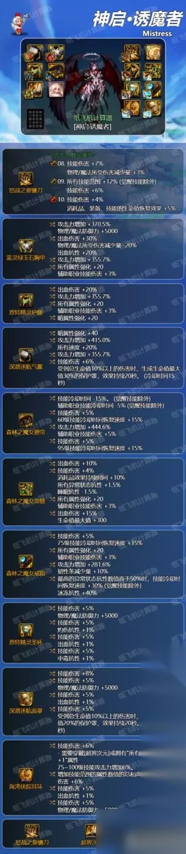 二、毕业装备搭配 前言:神界搭配流派众多,且可能存在多个平替或取舍部件,词条也存在备选(通常为属强/攻强类通用词条),本文推荐可作为思路参考,根据实际情况、选择适合自己的最为重要。(部分常用自定义的词条选择在本篇最后有一些建议) 【方案一】劳力士攻速流 搭配说明:四姨在321版本后天赋改版的情况下,选择保护天赋的觉醒解禁,可以连同变身冷却时间一起缩短50%,即实现了全程变身。 这个变化使上版本头疼的魔女戒指触发问题得以解决。因此四姨的劳力士攻速流配装对比别的职业要自由很多。裤子和项链位置只需要有一个速度件即可,可以微特化75技能的cd或者80级技能。如不特化也可以穿正常的自定义增加伤害,并且比别的配装少了一件自定义需求。综合来看是最有优势的配装了。下面列出无特化配装,并补充一些微特化的思路。