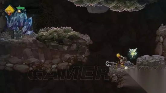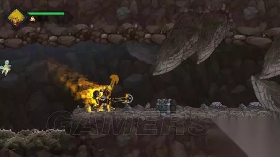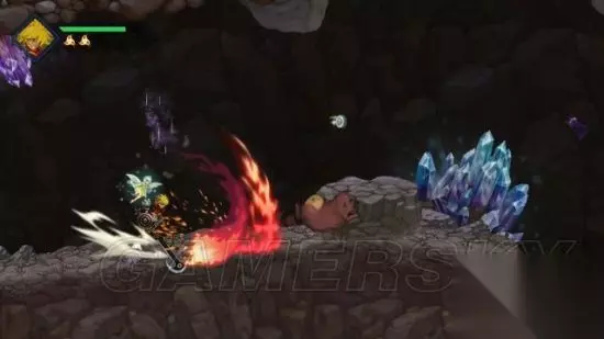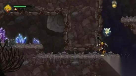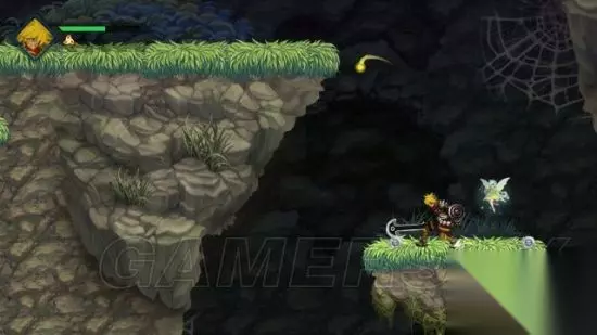 step1.瓦因一行人落到洞内,要当心小土波鼠(褐色),它们主要分两类,一是移动的,二是躲在坑内的(不会移动),两者都会投掷石块攻击,而后者要当心踩到它们,就连其所居住的土堆都会带有伤害。 另外蝙蝠会依附在洞穴天花板上,虽然它们的攻击能够被挥砍轻易化解,但往往会从瓦因毫无防备的情况下靠近,所以玩家要时刻注意。 去到洞穴一层左侧尽头,也就是红发小不点泡澡的位置,可以拾获一个宝箱(1/4),获得密米尔之杯。 去到右侧尽头就是进入到洞穴二层。