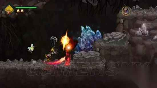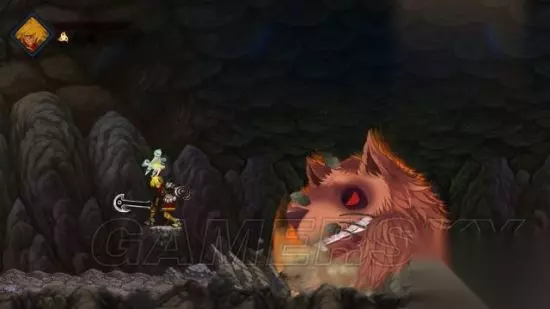 step2.刚进入到洞穴二层,门口左侧有一个卷轴可以进行存档,之后会较长一段路都不会再遇到卷轴了。 去到右侧台阶前,处于台阶上对着下方的三只褐土波鼠进行砍击,即便是大的褐土波鼠亦无法靠近。 然后要跃过一段荆棘,要注意高度,以免碰到天花的荆棘,然后就可以前往洞穴三层。