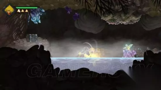step8.沿着山洞道路往上层跳去,在一些黑色的岩石背后是一些隐藏地带,从中可以获得席姆。 而在中层左侧的水池旁有一个宝箱(4/4),需要在后期以其他办法通过小窟窿进去拿到这个宝箱。