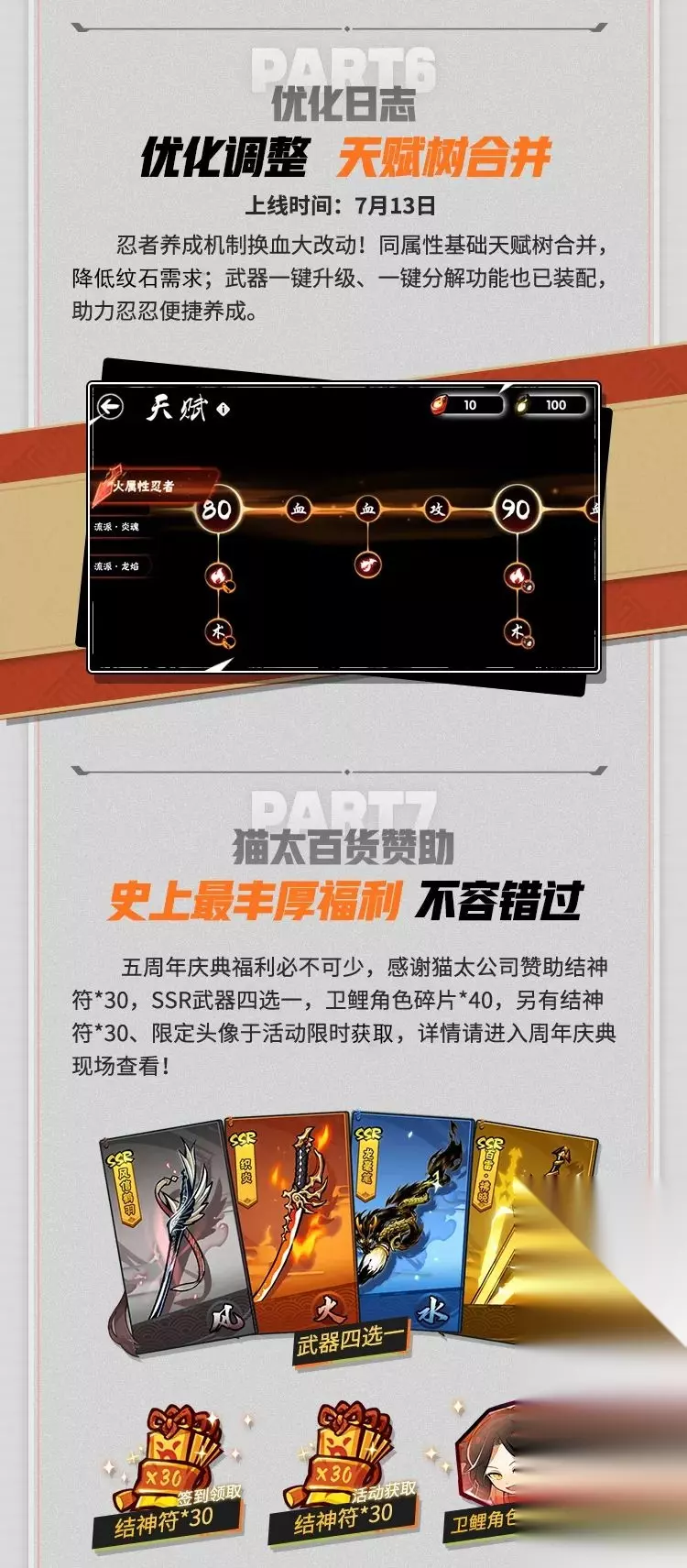 五周年盛典,福利爆发! ●两大新角色,老板娘&卫鲤登录忍界! ●全新十二章剧情,阳剑出世! ●全新火系神兵,双刀屠龙! ●两大顶级通用宝物,助力突破实力上限! ●更有两大全新玩法,助战周年庆! ●什么?新上两个新角色养成压力太大了?放心!忍者天赋树合并,养成消耗大大减少! ●忍忍最为关心的SSR四选一是哪四把?风信鹤羽,织炎,龙毫笔,百雷·拂晓! ●还有什么福利?结神符30连抽,签到就送!在新活动中,更能再获取30连抽!