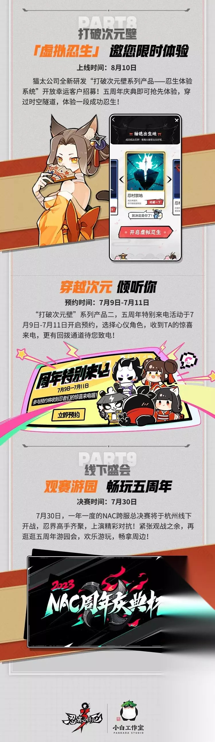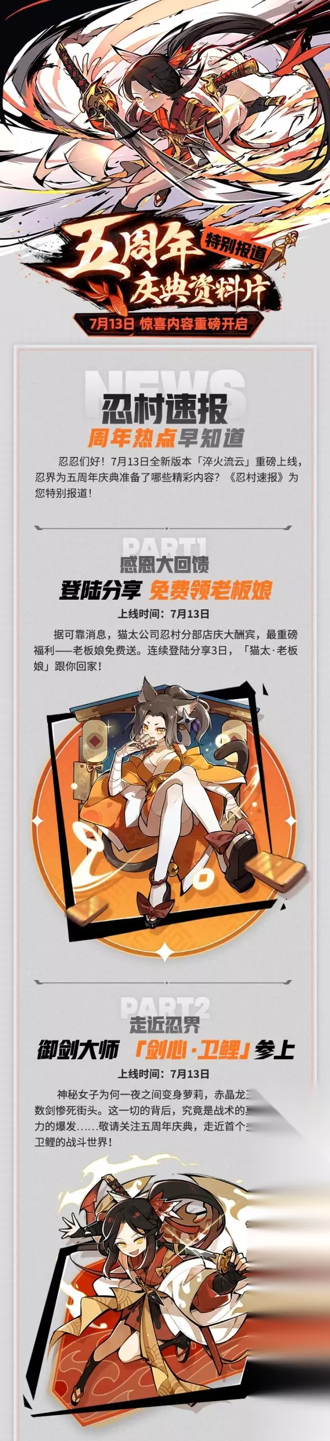 ●忍术开场清屏后,老板娘将投掷大量不可销毁的钱币,持续对boss造成伤害! ●随后,老板娘将投掷出招财猫炸弹,对boss进行大量伤害! ●最终,老板娘冲刺使用【罗睺斩】,造成大范围清屏伤害! 老板娘特殊技能:在充能完成后,老板娘还可召唤喵之僚机,瞬间恢复生命值、增加攻击力,并发射子弹进行输出! 忍忍:老板娘,你真的很强吗?我看你第一段忍术可是有点分散哦!会不会打不中boss? 老板娘:忍忍请放心,无论面对哪种boss,妾身的输出都将处于绝对的前列!所以这次五周年庆,忍忍们一定要抓住机会领到我~ 忍忍:老板娘!既然你这么强,领取你的条件是不是特别苛刻呀! 老板娘:连续登录分享三天就送!妾身从不说谎~ 盛大五周年,精彩继续! 除了可以免费领取的老板娘外,强悍的【卫鲤】与新武器【怒鲤双生】,以及新剧情、新优化、新玩法、新宝物…都能够彰显五周年盛典的宏大规模!五周年盛典将于7月13日版本更新后正式为忍忍们开启,期待与你正式并肩作战!!