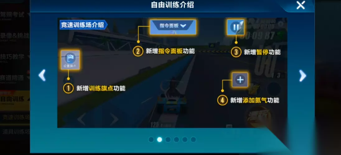 自由训练场的核心功能包括旗点设置、重回起点、暂停以及指令面板操作。旗点功能允许玩家在赛道的任意位置设置标记,通过返回旗点实现重复练习特定路段的效果。指令面板提供氮气控制、赛车回退等高级选项,方便玩家调整训练参数。竞速训练场还设有圆盘训练广场,该区域无赛道限制,适合测试赛车性能或练习基础操作。