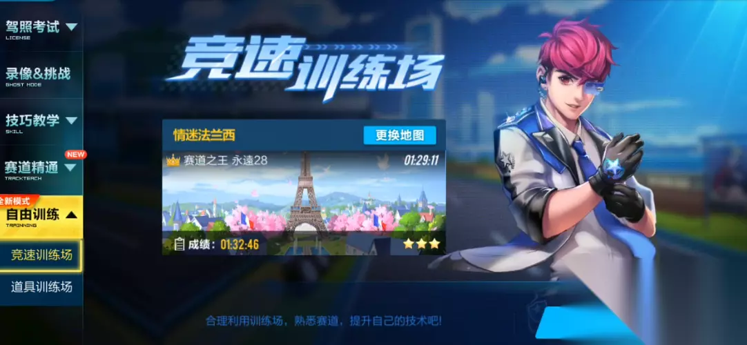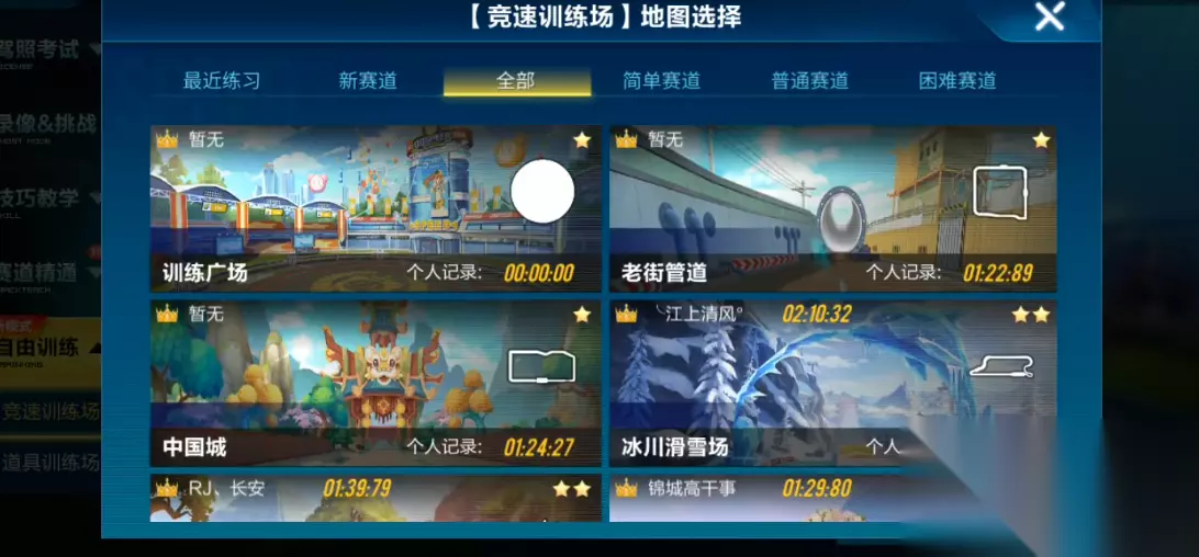 自由训练场位于游戏主界面的个人生涯模块内。进入游戏后,点击右下角的个人生涯按钮,随后选择自由训练模式,即可看到竞速训练场和道具训练场两个选项。竞速训练场主要用于练习漂移、氮气控制等基础驾驶技巧,而道具训练场则侧重于道具使用和战术配合。两种训练场均提供自由选择地图的功能,玩家可根据自身需求进行针对性练习。