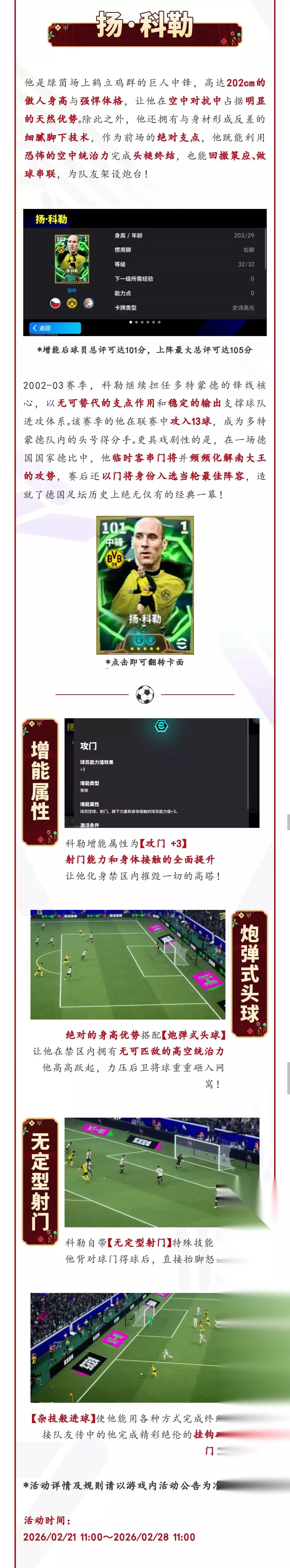 他是大黄蜂军团统治力十足的“捷克恐龙” 高大威猛的身躯,让他化身禁区攻城高塔 禁区腹地的每一次起跳,都令对手胆战心惊 凭摧枯拉朽的暴力头槌,铸就一代 “空霸” 威名 双增能史诗高光扬·科勒即将登场! 更多活动详情快跟阿况一起来看看吧!
