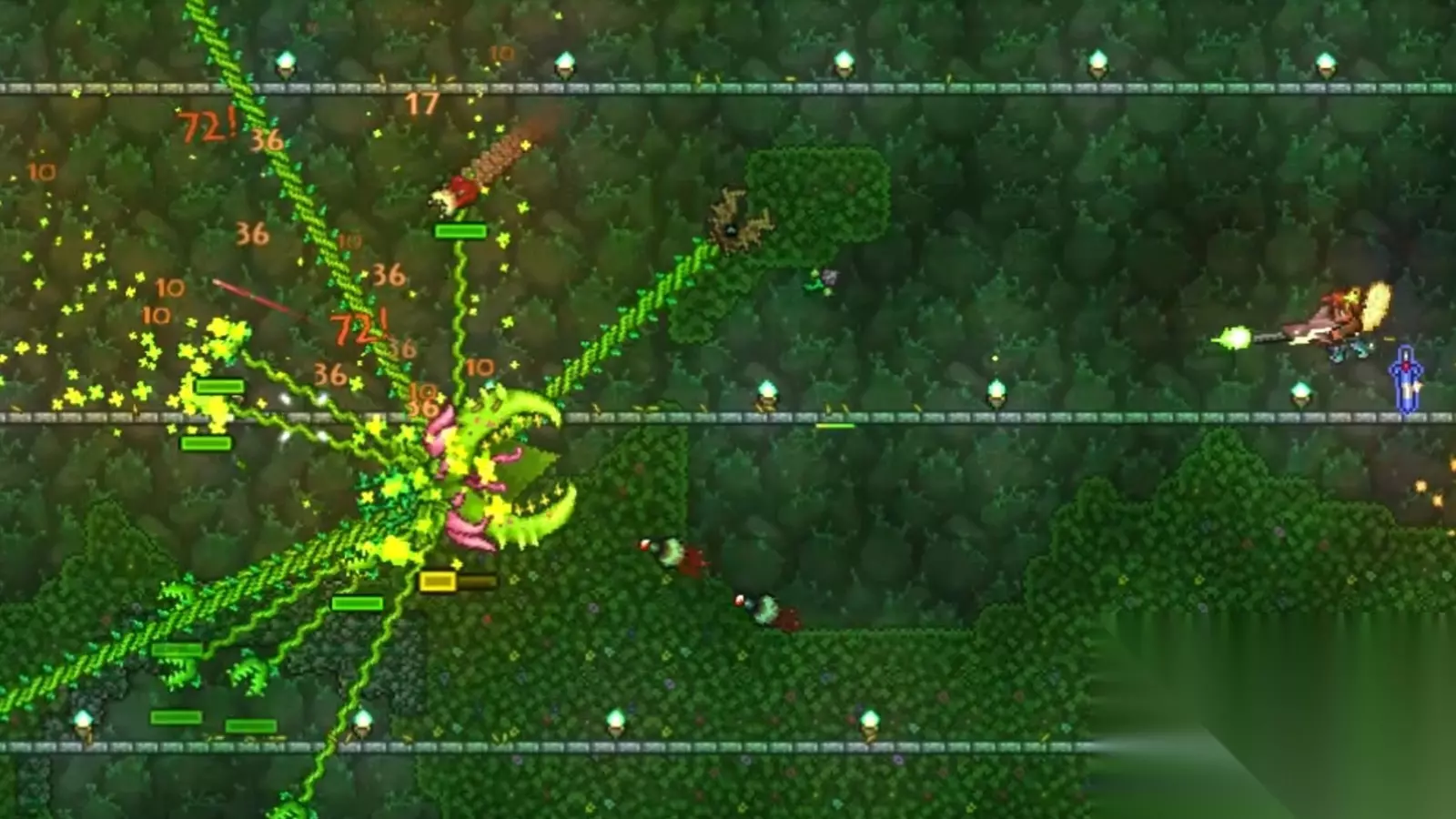 第一阶段保持中距离输出,利用平台垂直走位躲避种子和刺球。通过地图观察Boss位置,提前用死神镰刀这类穿墙武器进行输出。第二阶段优先清理卷须,每根1000生命值,摧毁后不再重生。尽量远离地面避免被刺球击中,用远程武器攻击主体。遇到冲刺时触发传送机快速躲避,血量危急时饮用强效治疗药水。