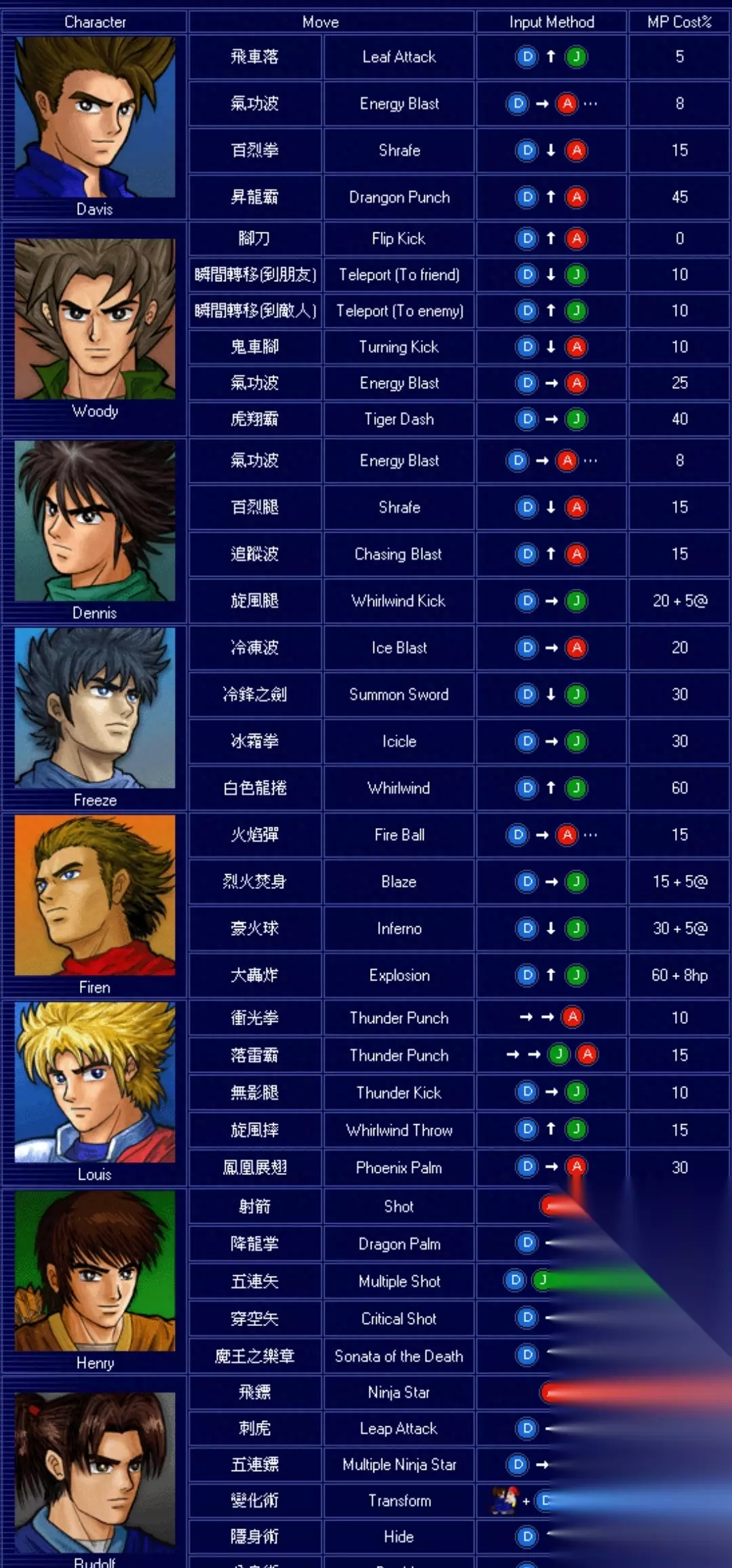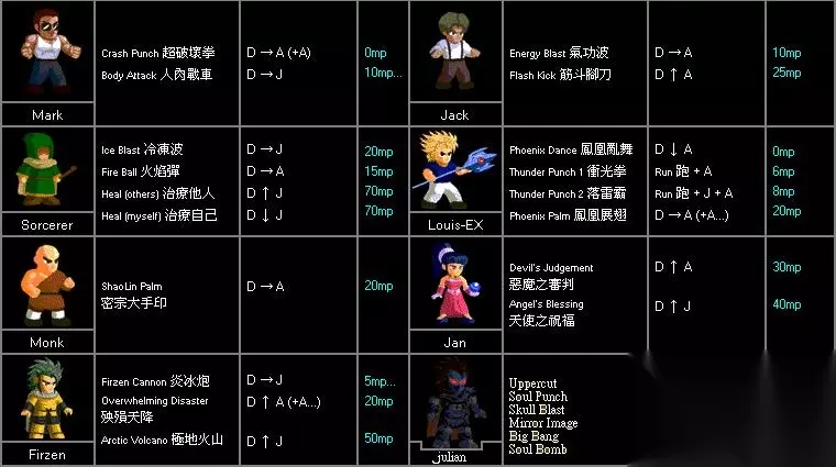 LF2部分角色出招表 这游戏当年也是火过一阵子,目前经典版本稳定在2.0版,通过出招表也能看出,来来回回就这些招数,很快就被人发掘完毕,或者说,有许多人并不满足于经典版有的角色和招式,于是出现了各种各样的改版,比如:疯狂版、火影版、龙珠版、海贼王版等等。 通用操作: D代表挡,J 代表跳,A代表攻 角色出招表(附图):