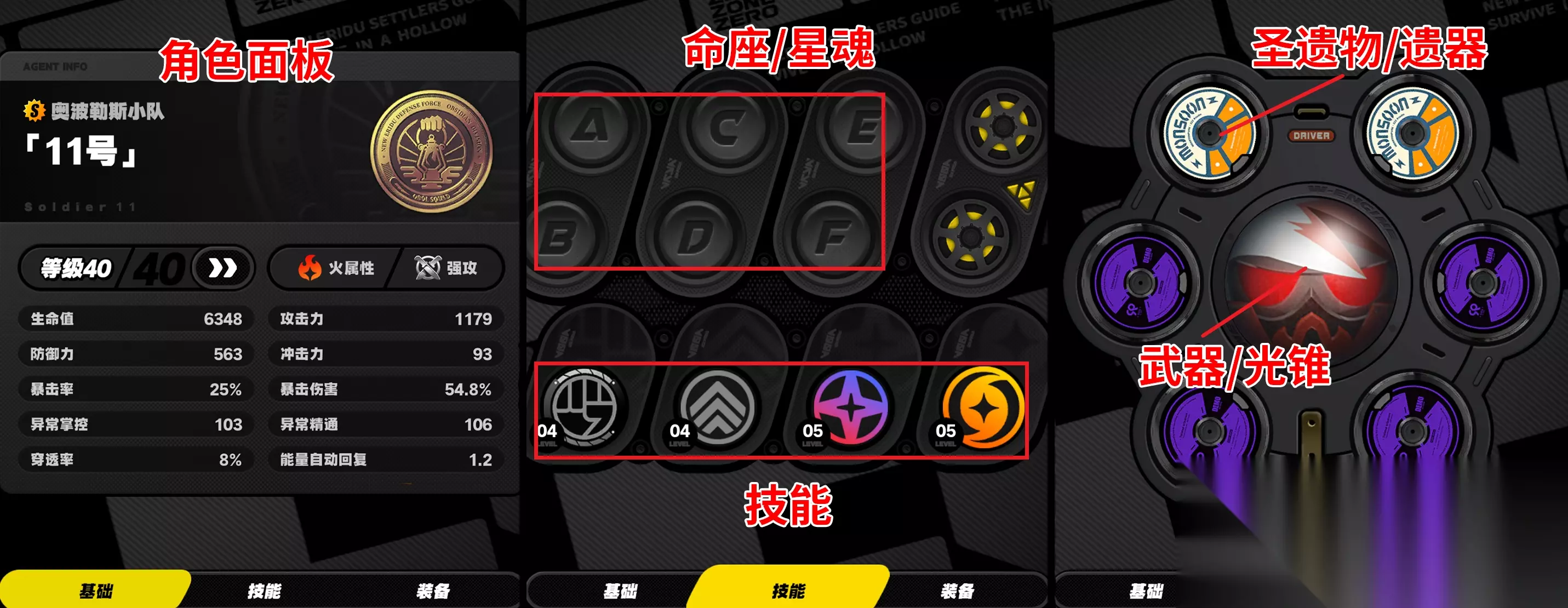 1,那先说一下养成系统,还是比较熟悉的(主要就是圣遗物/遗器,武器/光锥,技能,命座/星魂) 相信玩过原神或者星穹铁道的小伙伴都能轻松上手(可以看下面的养成界面,简单了解一下)