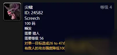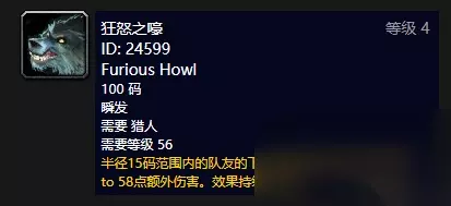 狂怒之嚎 可学宠物:狼 获取位置:黑石塔(血斧座狼)、刀锋山(血槌座狼)、纳格兰(黑色座狼)、泰罗卡森林(森林巨狼)
