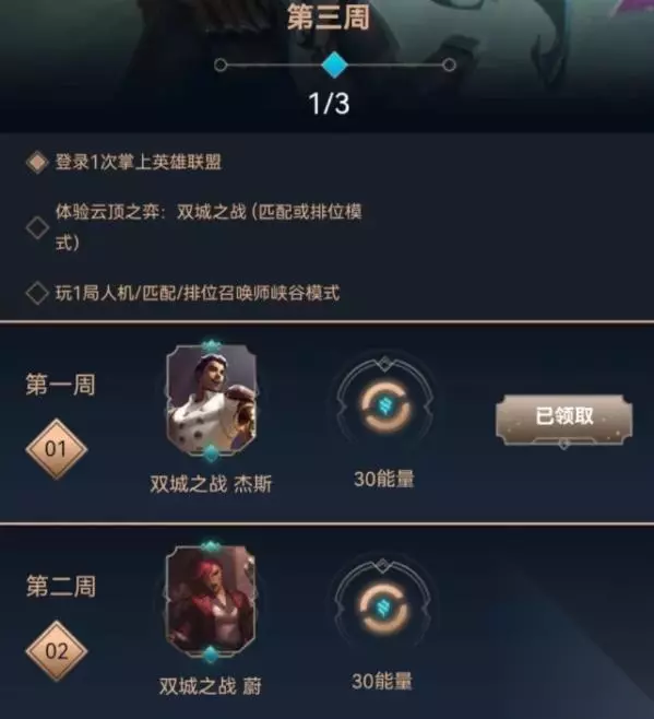 要等整局打完结算,我就是打了一把第四,出去没刷新,等剩下三个人分出胜负就有了。 就是下把棋,等第一名结束那把游戏才算结束 别急 只是有延迟。 我小号打一把就有了 大号起码延迟了一小时才给我算 在英雄联盟中,2022 季前赛即将来到峡谷,并带来新道具、一个基石符文、战略点悬赏和海克斯科技与炼金科技亚龙。别忘了,完成每周任务就能获得双城之战蔚。在英雄联盟云顶之弈,第六赛季的环境初步稳定,炼金科技的各种配合正好帮你提前进入底城之夜的庆祝情绪。 全新游戏模式双人作战将正式登陆云顶之弈,你可以和好友并肩作战,一起刷完最后一枚金币,寻找阵容急需的维克托。 以上就是这一期为大家带来的云顶之弈双城之战模式里面的任务完成攻略分享介绍了,希望对玩家们有所帮助。