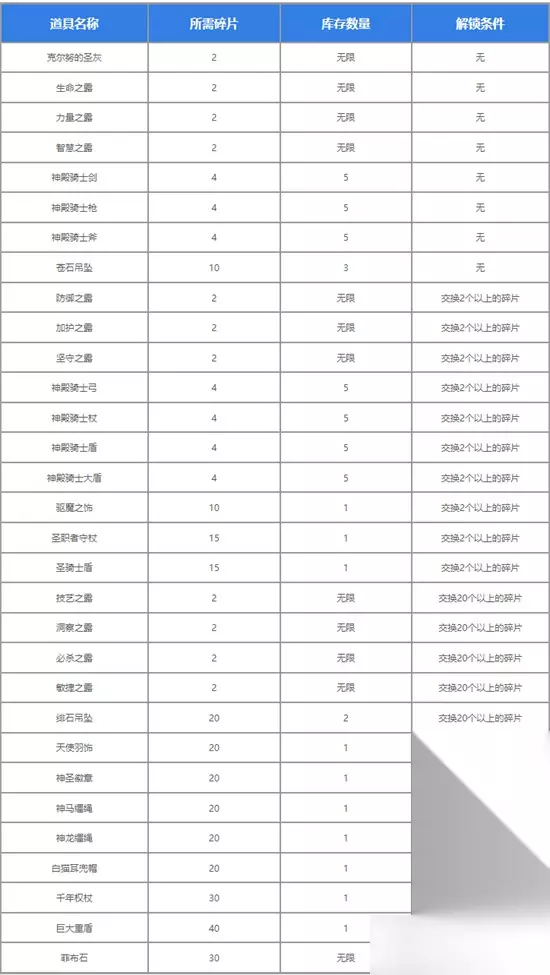 天之碎片可以通过地图拾取获得,也可以通过采掘场挖掘获得。可以用来在天之碎片兑换所交换道具。 天之碎片兑换所会在完成任务天翼骑士后解锁。除此之外,收集齐30枚天之碎片后可以让奥古丽斯(翔羽剑士)加入队伍,此职业在前期非常好用。 天之碎片可兑换道具 完成任务天翼骑士后,与奥古丽斯对话,选择「同意」交出天之碎片,可以获得「生命之露×3」、「力量之露×3」和「防御之露×3」。