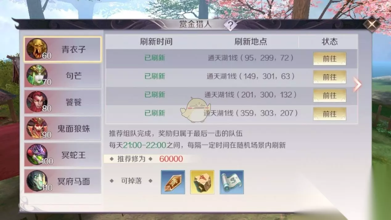 赏金猎人活动在每周的二、四、六三天的21:00~22:00开启,在活动开启之后,规定时间段内会在野外刷新出不同等级的怪物,如果小伙伴们比较细心地话,会发现这些怪物都是我们曾经刷过的副本中的boss,在技能设置上也没有太大的变化,但是这些怪物的攻击力和血量都得到了很大的增强,此外,因为这些怪物是在野外刷新,任何玩家都可以对其进行攻击和击杀,但是最终的奖励并不是所有参与进攻的玩家平分,最终的奖励只归最后一击或者伤害最高的队伍所有,我们可以根据不同的情况选择不同的boss。 因此,综合难度和上述设定的来考虑,我推荐大家组成小队前往活动,一来加快杀怪效率,二来防止胜利果实被其他玩家窃取。如下图所示,会给出boss的刷新地点,在这提醒大家,如果队伍实力较弱,可以向后面翻几页,后面boss的争夺不会那么激烈。