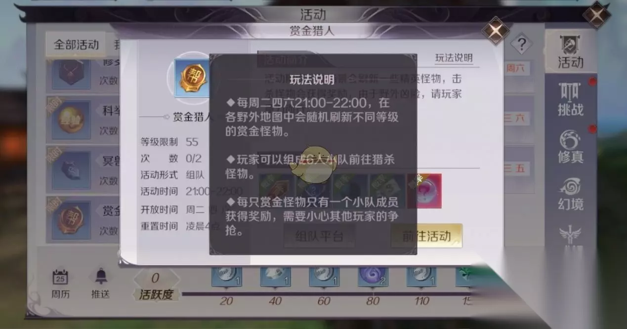 (这里需要注意后面boss的竞争相比前面没那么激烈,所以大家要记得翻页。) 下面我们再来看看赏金猎人的奖励有哪些,首先是悬赏令,在击杀boss之后将会概率掉落,boss的等级越高,掉落的悬赏令越高,持有悬赏令一定时间之后可以用其兑换成赏金令,后者可以用来兑换声望、银币和装备打造材料等等。 但是有一点值得注意的是,当我们持有悬赏令时,如果被其他玩家击杀,那么悬赏令就会掉落,所以我们在击杀boss捡取悬赏令之后,队友之间要相互保护,避免被其他玩家捡漏。而且,当持有悬赏令时,换线、离开当前场景和下线操作都会导致悬赏令掉落,这一点我们一定要注意。除了悬赏令之外,赏金猎人活动的奖励还包括灵媒、灵石、上古密卷、镌刻材料以及未鉴定内丹等奖励,其中悬赏令为概率掉落。 下面我们再来简单说说在打怪时候的注意事项,因为是在野外打怪,引怪的范围更大更灵活,所以也减轻了引怪玩家的压力,另外,还有一个窍门要告诉大家,就是在野外场景中我们是可以使用飞行道具的,所以,输出玩家可以使用飞行道具升到半空对怪物进行攻击,这样可以躲避掉大多数伤害。 但是还是要注意怪物的仇恨,防止被其他队伍玩家抢夺。对于实力较弱的玩家,可以选择错峰进场。boss为分拨刷新,数量上够大家都获得奖励,我们可以晚一点前往,选择适合自己等级的boss。