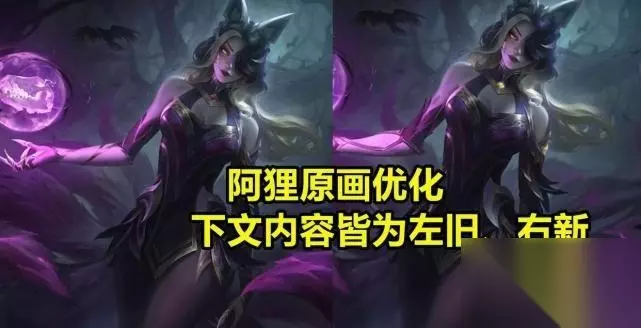 注:左旧、右新,下文皆是如此 可谓“大不如前”。 本轮改动之中,2张原本非常优秀的立绘被毁,其一是勇者阿狸。勇者阿狸算是LOL最经典的原画之一了,多次出现在各种海报上,画风精细,百看不厌。