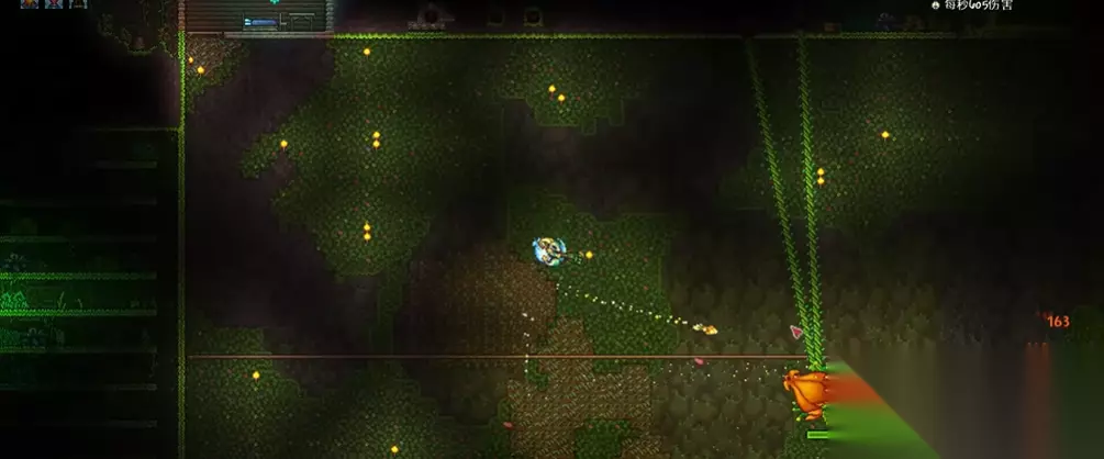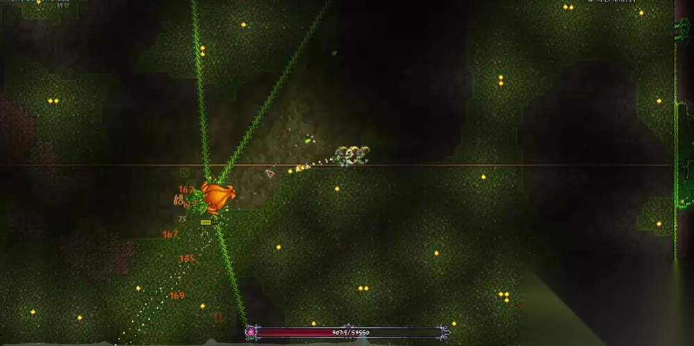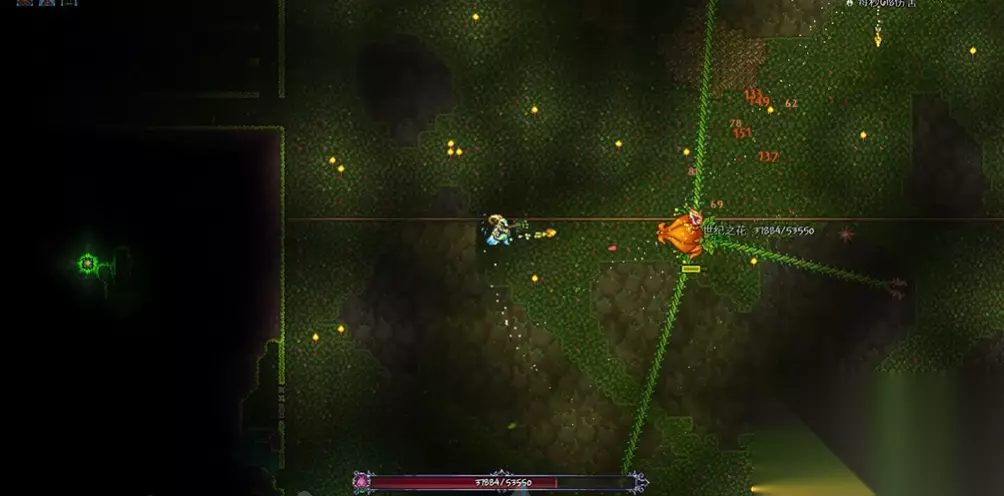 战斗过程中,第一阶段应保持中距离输出,利用平台垂直走位躲避种子和刺球,通过地图观察Boss位置并提前使用穿墙武器如死神镰刀进行输出。进入第二阶段后,世纪之花移动速度加快,此时优先清理连接在主体上的触手,每根触手有1000生命值,摧毁后不再重生,同时尽量远离地面避免被弹跳刺球击中,使用远程武器专注攻击主体,并注意躲避空中飘落的孢子,避免被逼入狭窄角落。